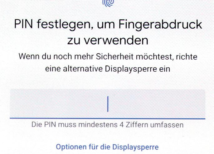 Zunächst müssen Sie einen PIN eingeben, den Sie dann zur Geräte-Entsperrung verwenden können, wenn Ihr Finger etwa nass sein sollte und vom Smartphone nicht erkannt wird. Um Fehler bei der Eingabe zu vermeiden, muss dieser Code gleich zweimal hintereinander eingetippt werden.