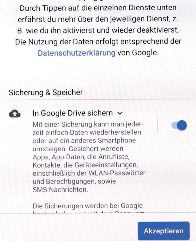 Im nächsten Schritt können Sie diverse Google-Dienste aktivieren oder deaktiveren. Mit einem Tipp auf den An-/Ausschalter n können Sie die einzelnen Einstellungen vornehmen. Mit einen Tipp auf „Akzeptieren“ o schließen Sie die Anmeldung ab.