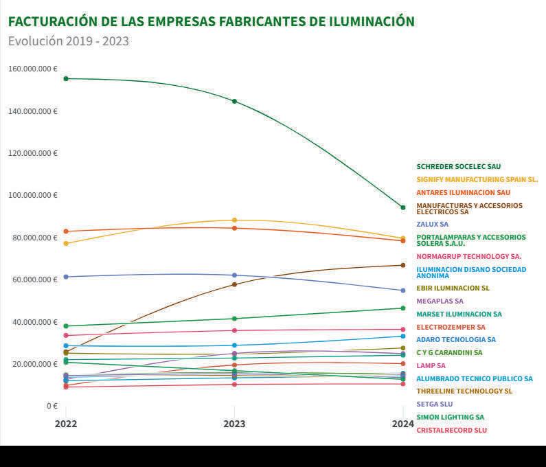 tos eléctricos de iluminación’. Esto hace que queden fuera otros proveedores relevantes, como es el caso de Ledvance, que figura bajo el CNAE primario 4647 ‘Comercio al por mayor de muebles, alfombras y aparatos de iluminación’ y que logró una facturación de 33,6 millones de euros en 2024.