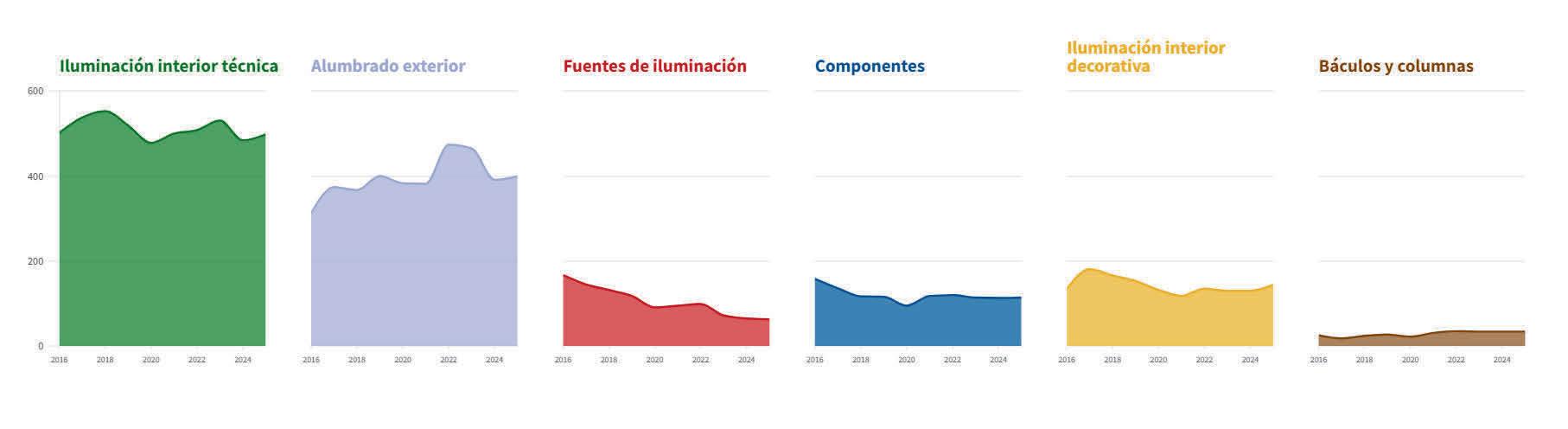 de su cifra de negocio por tercer año consecutivo. Desde 2022, cuando las exportaciones alcanzaron los 530 millones de euros, momento en que la industria facturó 1.373 millones de euros (el mejor dato de los últimos diez años), los siguientes tres años han sido de caída constante: 477 millones en 2023, 443 en 2024 y nueva bajada hasta los 420 millones en 2025. Por tanto, en los últimos tres años la industria de la iluminación ha reducido el valor de sus exportaciones en 110 millones de euros, un 20,75 %.