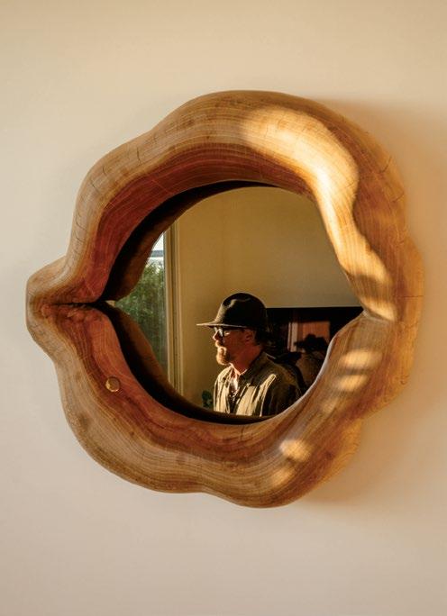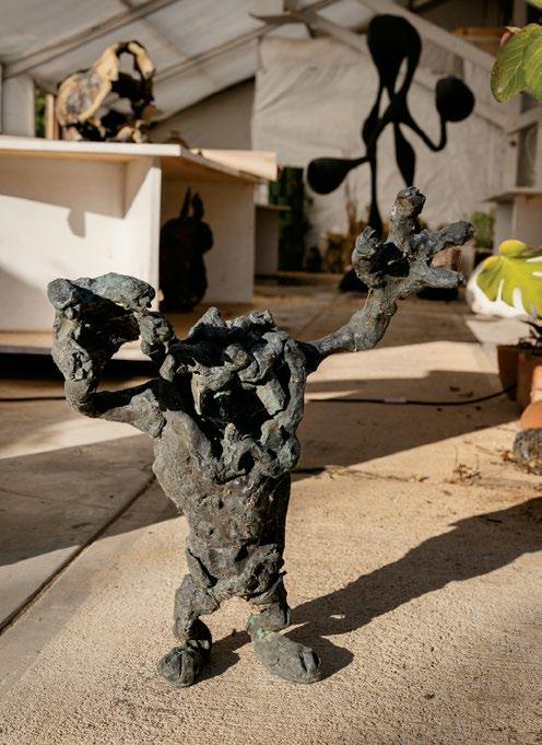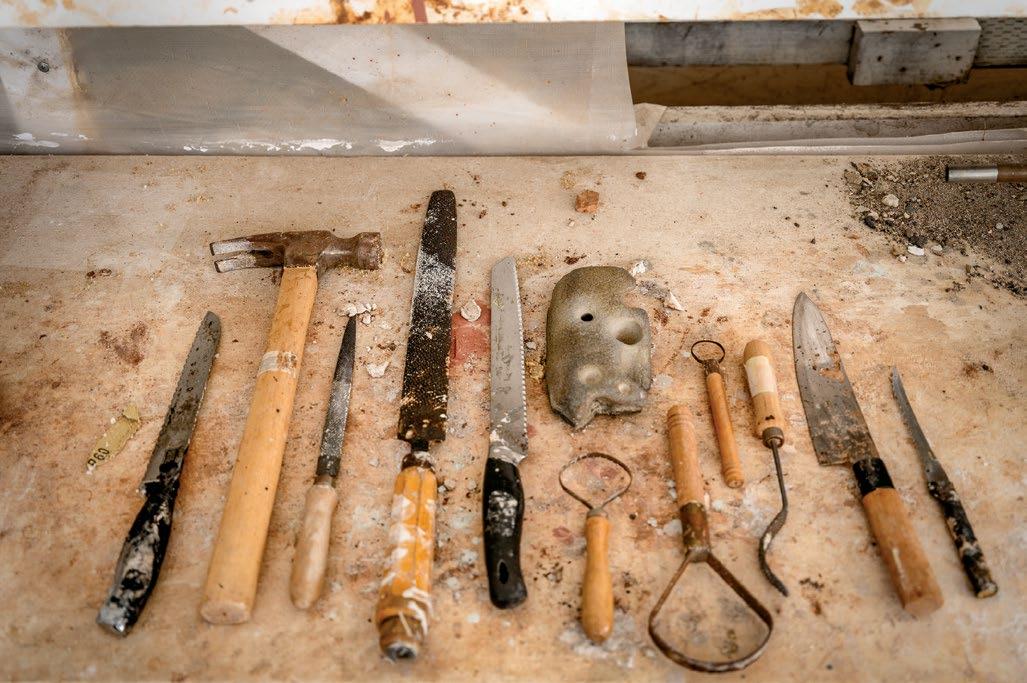Using gypsum, bronze, or even animal hides, Gregory makes functional sculpture, wall-hung mirrors, and lighting. Opposite, from top: The entrance to Gregory’s studio is flanked by ancient-looking potted palms and carved wooden sculptures; the wellworn tools of his trade.