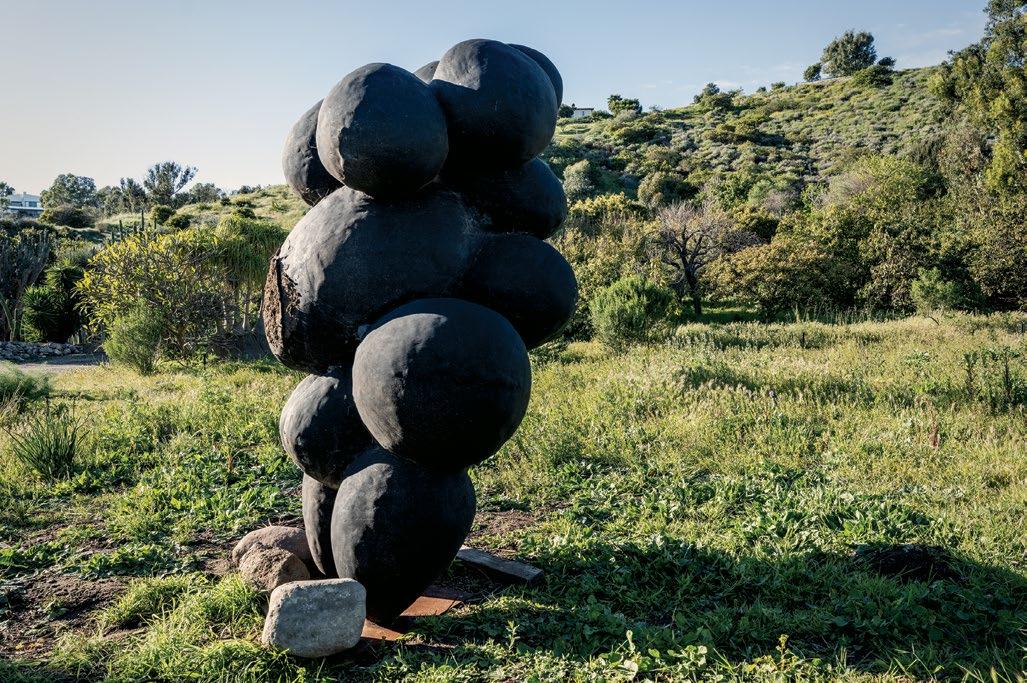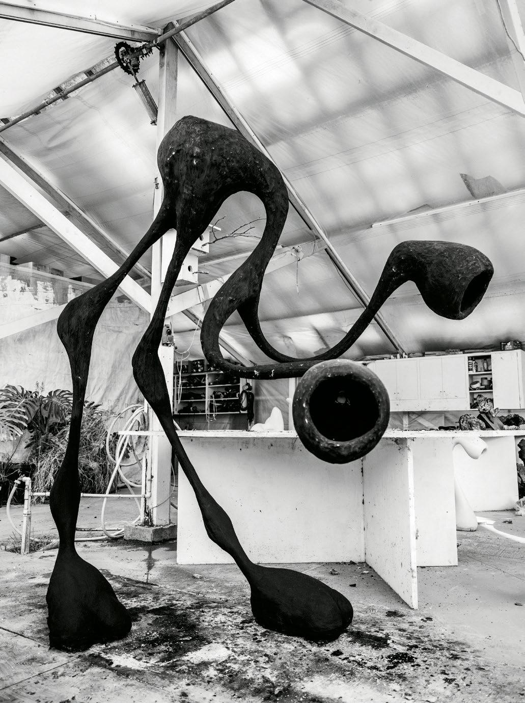 Opposite, from top: For additional storage at his greenhouse studio, Gregory uses matte black industrial containers; his sculptures dot the 10-acre property surrounding his Malibu workspace.