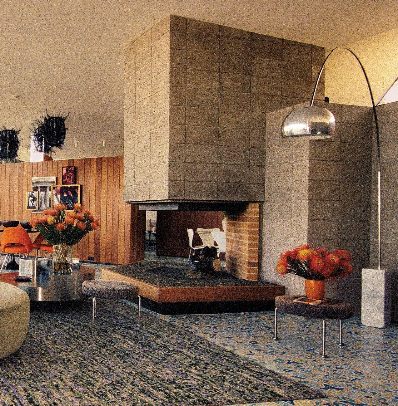 The interiors are open, allowing the one-of-a-kind tile floor — a design by Cuban artist Jorge Pardo, a friend of the couple — to flow through the house, gradually deepening in tone.