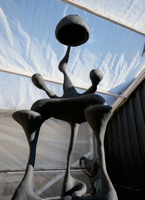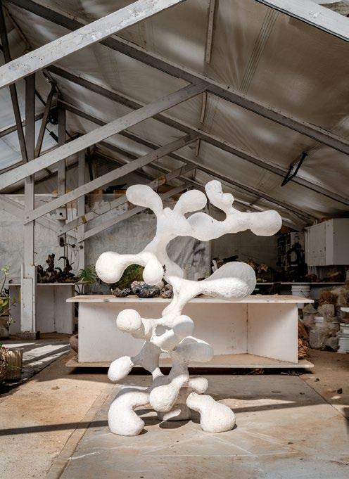 From top: An unfinished sinuous gypsum and gauze-wrapped metal sculpture is exposed to the elements; Gregory’s carved pieces resemble objects found in nature.