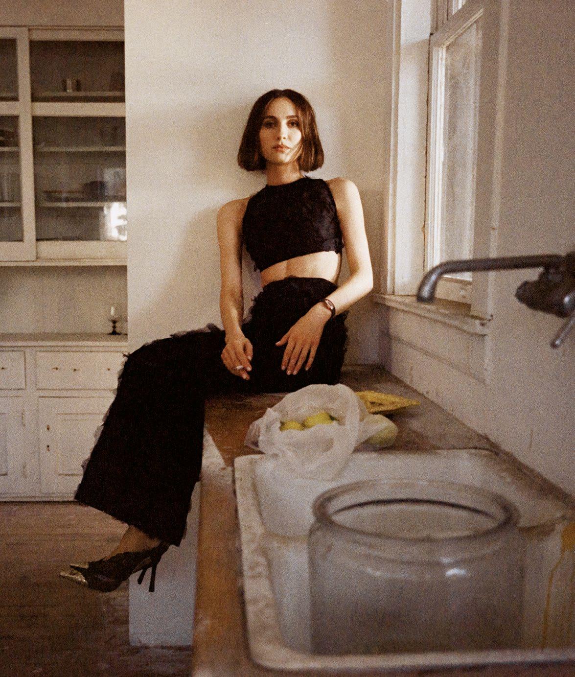 MAUDE APATOW wears KHAITE top, $3,600, skirt, $4,400, and belt, $980. CARTIER watch, $44,000.