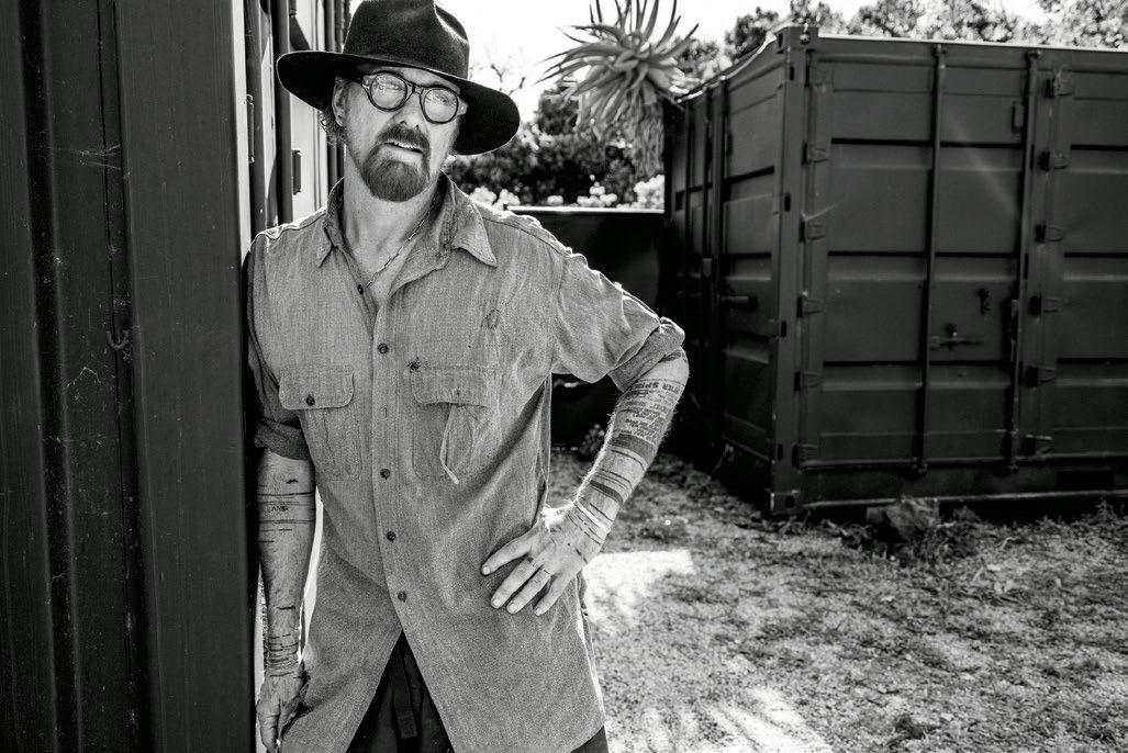 plastic tarp, suspended over a white wooden frame, rustles in the wind to reveal patches of blue sky above it. A pair of towhees fly in, dodging a 10-foot-tall white sculpture, to land on a roughhewn bird feeder, scattering seeds on the concrete floor. A fountain hidden in a tangled mass of potted plants gurgles softly. At the center of it all, Rogan Gregory gestures around the structure — an open-air artist studio inside an old greenhouse on a regenerative farm in Malibu — with his paint-stained hands.