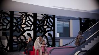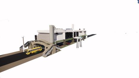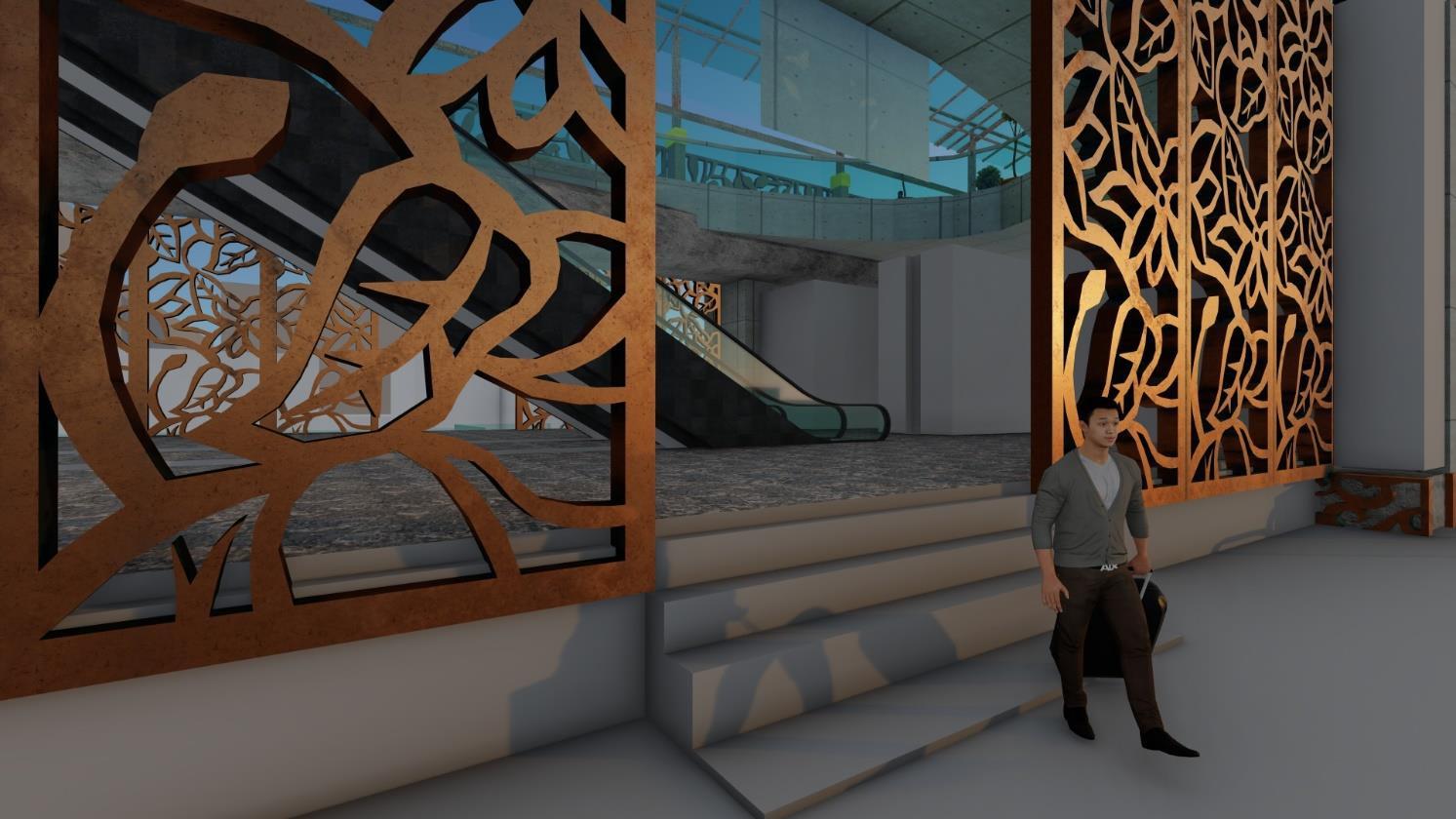 Ruang tunggu sebagai jembatan untuk pengguna membaur dengan masyarakat lain untuk pergi ke suatu tempat kerja dengan menggunakan alat trasnportasi yang mereka inginkan. Selain itu ruang tunggu dijadikan ruang utama sehingga dapat memenuhi prinsip Densify yaitu memadatkan suang ruang berbagai aktivitas pengguna dapat terjadi di ruang tunggu tersebut. E.Connect(Menghubungkan) Menghubungkan dari kedua sisi jalan dengan sistem memasuki ruang LRT tersebut akan tetapi tidak masuk kepada jalur/lintasan LRT lebih tepatnya di lantai bawahnya veron