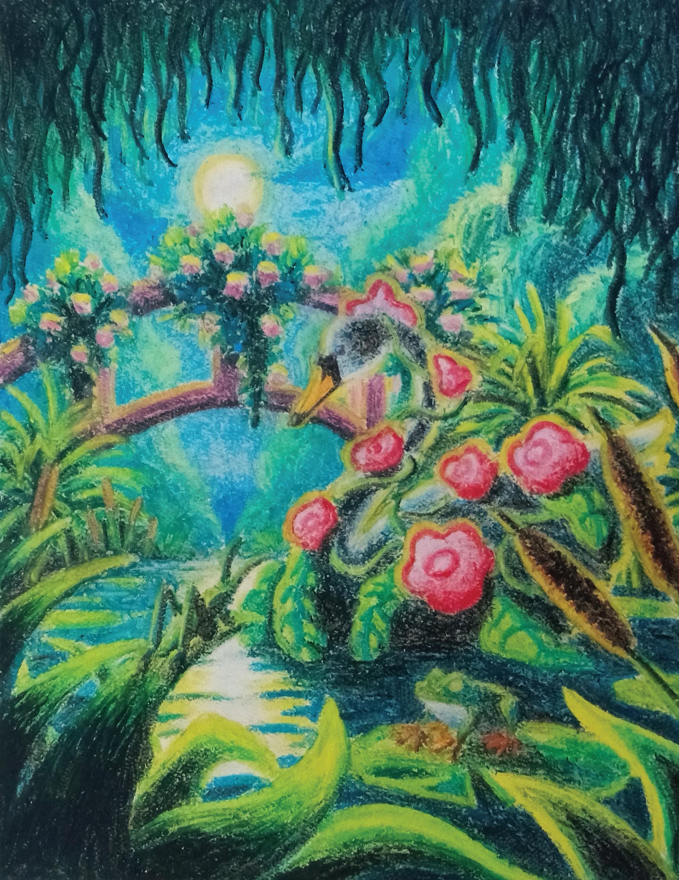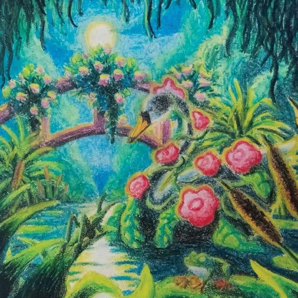 Michael Mullenix is an artist specializing in 2D art. He is inspired by nature and everyday moments. His piece Blooming Swan was influenced by a trip to the Des Moines zoo where he saw the “Lights at the Zoo.” A display of swans caught his attention; he said, “each swan was at least ten feet tall and were glowing with flowers surrounding them. Another inspiration for this work is the artist Clause Monet, whose paintings influenced the impressionist feeling I hoped to capture in this piece.”