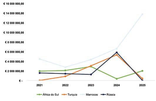 EVOLUÇÃO DAS EXPORTAÇÕES PARA ÁFRICA DO SUL, MARROCOS, TURQUIA E RÚSSIA