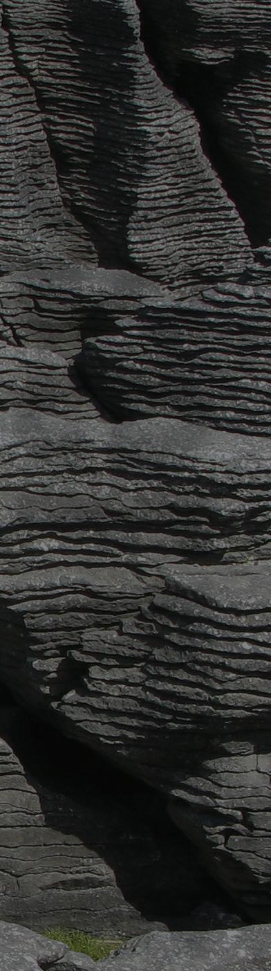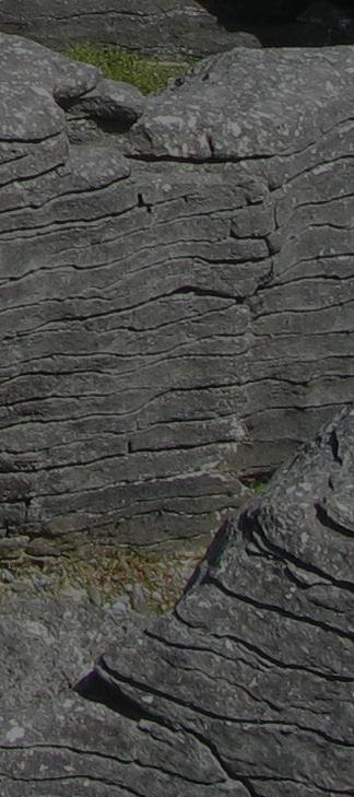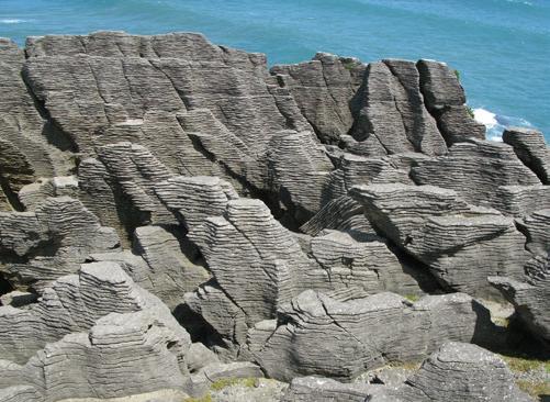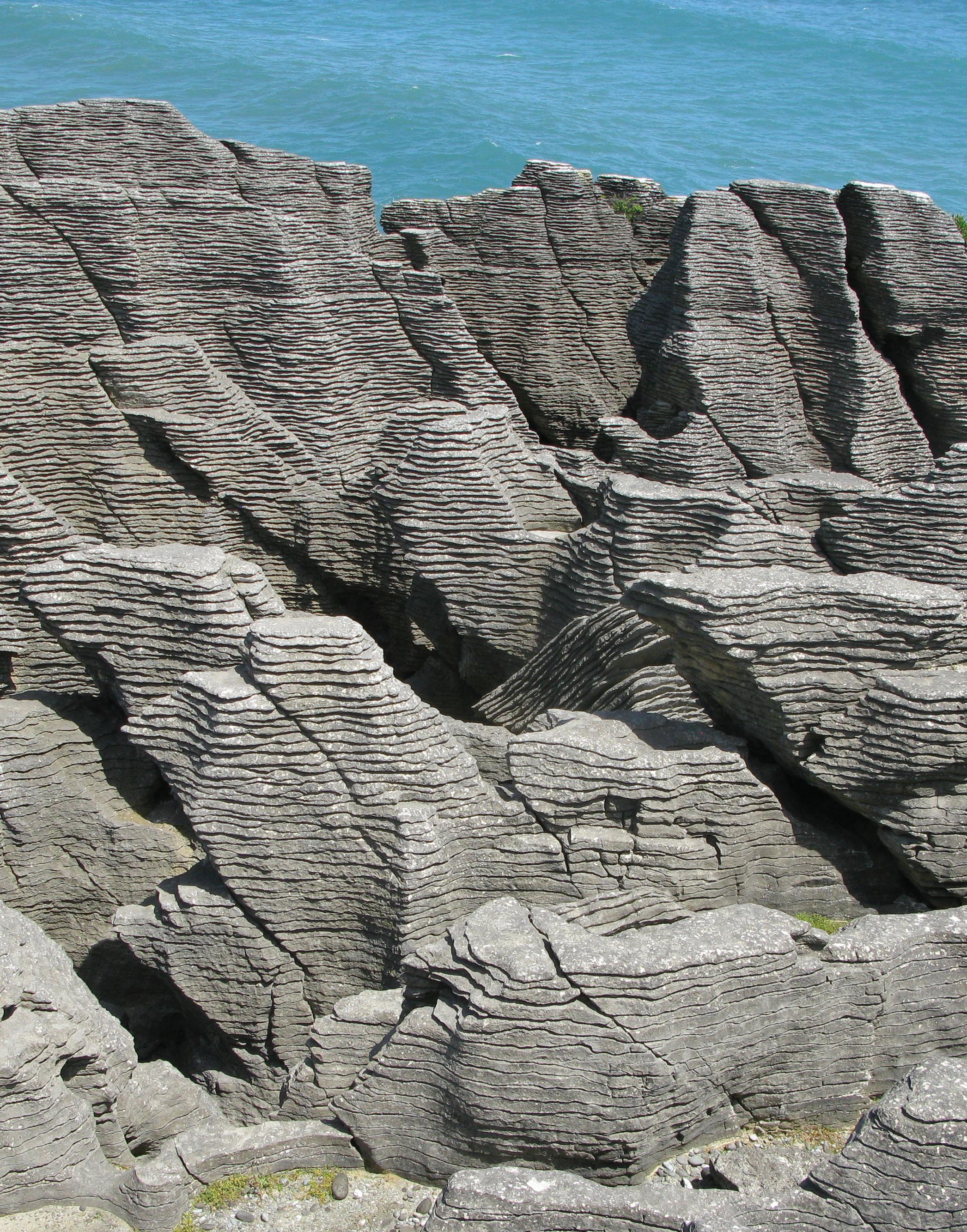 This view is looking west to the Pancake Rocks near Punakaiki in Paparoa National Park on the northwest coast of the South Island of New Zealand, adjacent to the Tasman Sea. The Pancake Rocks are a series of shallow water limestones that are part of the Oligocene Waka Supergroup. They were exhumed and exposed during the Kaikoura Orogeny that began in the Miocene and continues today, uplifting the South Island. During burial and compaction, the limestones were subjected to pressure solution. The resulting formation of stylolites involved the creation of thin layers of insoluble residue within these strata. Those surfaces became planes of weakness during uplift and erosion, leading to the creation of this distinctive layered appearance.