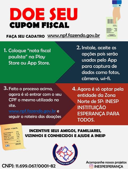 Uma das forma de contribuir para a continuidade do trabalho realizado pela INESP é a doação dos cupons fiscais das suas compras pelo site ou aplicativo da Nota Fiscal Paulista.