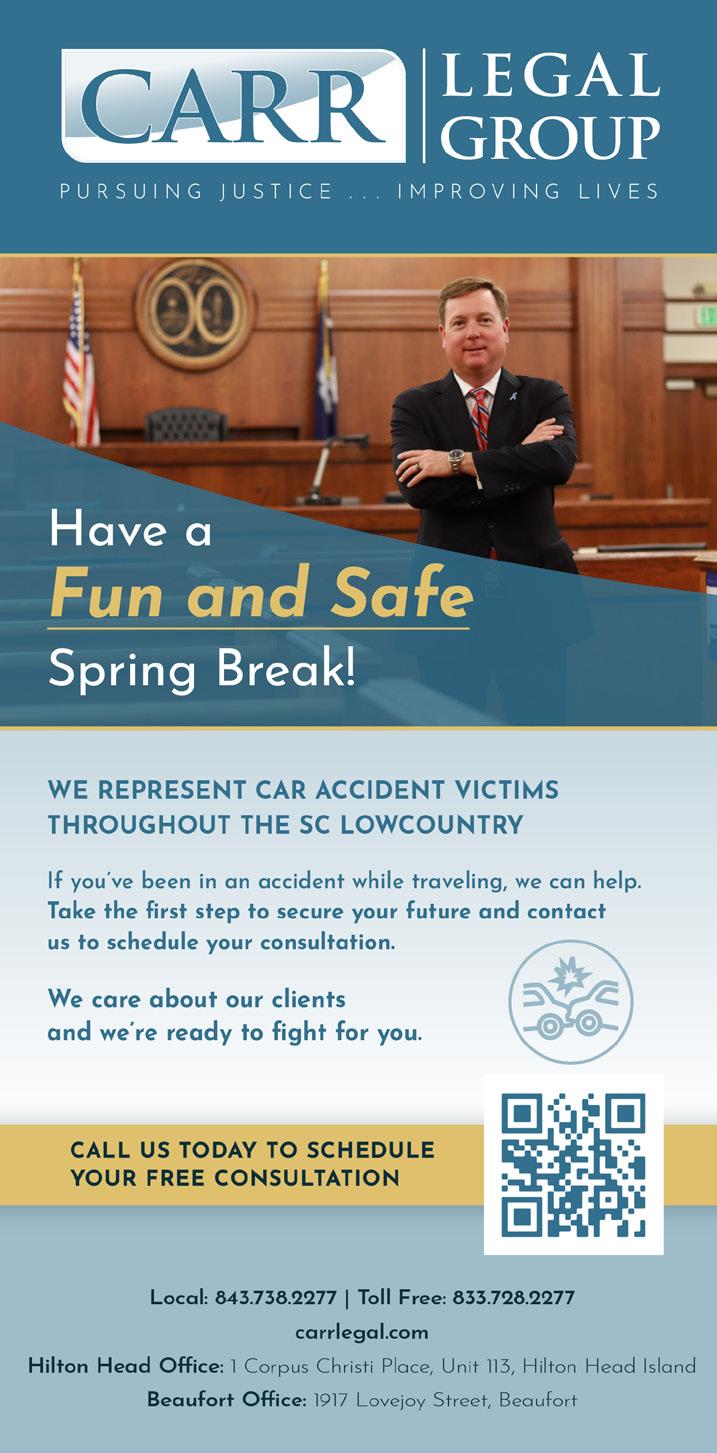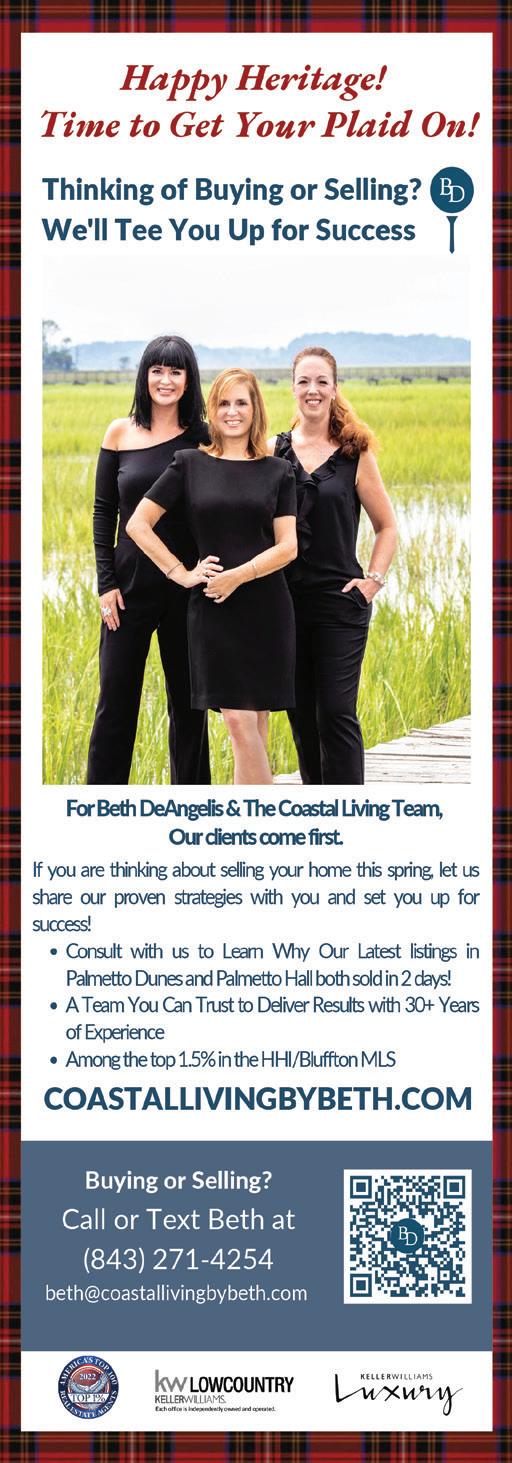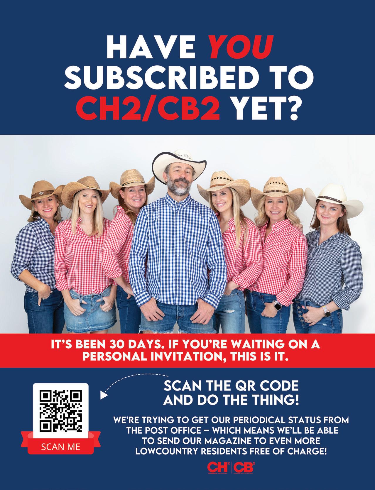 with family and friends. We brought our favorite culinary duo back to share some of their favorite recipes for these parties. Check out “A Spring Soirée with Chef Lynn Michelle and Cassandra Shultz” on page 28. I’m not usually a lamb person, but I could not stop eating the lamb lollipops Chef Lynn Michelle served with her Mint Emulsion Sauce. Chef’s kiss! In closing, I will beg of you once more to please subscribe (for free!) to this magazine if you enjoy getting it in your mailbox every month (or online only; there is an option for that as well!). We are applying for our periodical status with the post office to save money on postage so we can send this magazine to even more people free of charge. Our goal is to have the subscribers we need by October 6. Even if you have gotten this magazine every year for the last 16, we need you to scan the code and do the thing if you want to keep receiving it. The Lowcountry is growing, and we want to expand our reach even further. Have a wonderful April. I hope to see you at the RBC Heritage or some other spring event.