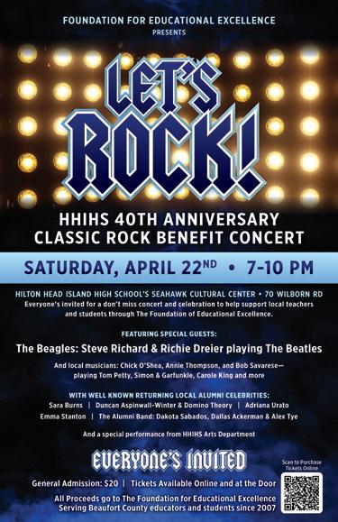 The Foundation for Educational Excellence presents “Let’s Rock!”—an evening of classical rock performances by well-known local bands, musicians, and students. The concert will take place Saturday, April 22 from 7-10 p.m at Hilton Head Island High School’s Seahawk Cultural Center, 70 Wilborn Road, Hilton Head Island. The event is a fundraiser for the Foundation, but also a celebration of the fortieth anniversary of Hilton Head Island High School.
