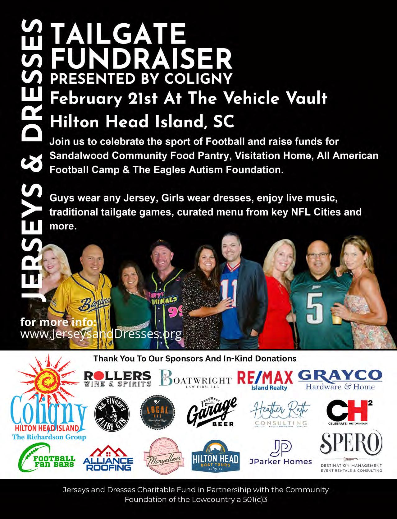 Along with the food, live music from Nashville’s Paul Juneau, and TVs showing highlights from the past season and beyond will keep the tailgate atmosphere humming. And of course, the entire evening serves as a massive fundraiser for a host of worthy organizations, including the Sandalwood Community Food Pantry, Visitation Home of Hilton Head, the Island Rec Center’s All American Football Camp, and the Eagles Autism Foundation.