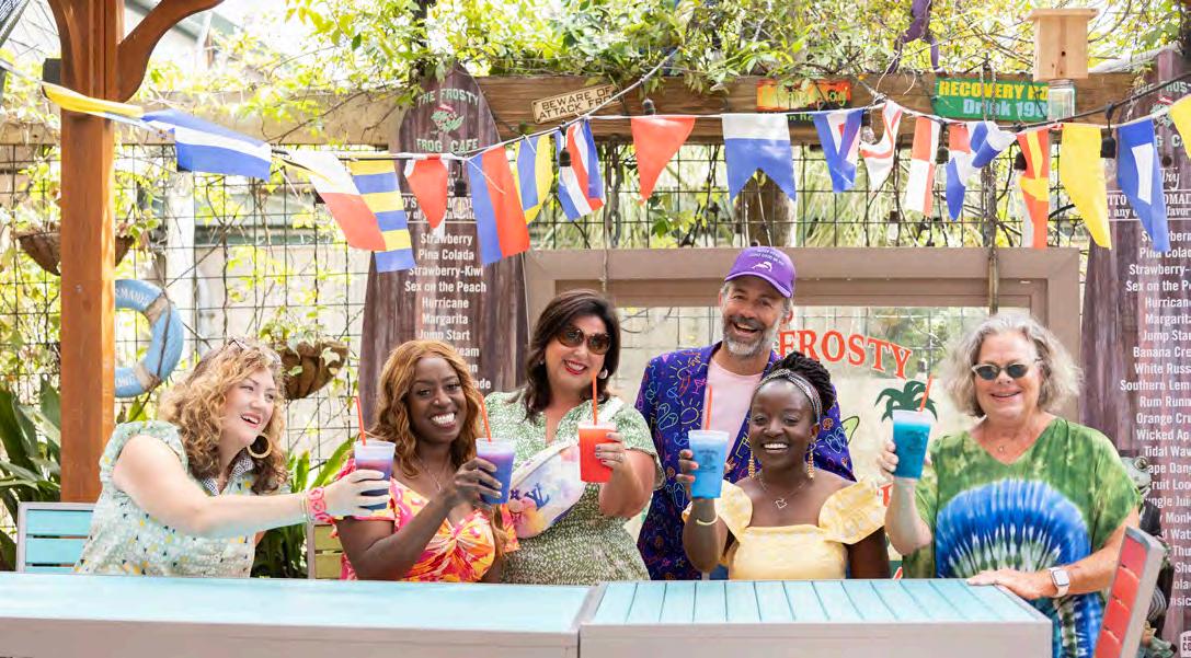 Caitlin Lee, Denise Stevenson, Heather Rath, Jevon Daly, Lola Campbell and Egan McGlynn film a scene about drinking frozen daiquiris at the Frosty Frog in Coligny Plaza. Shout-out to this crew for looking so pretty and festive the Monday morning after Heritage Sunday!