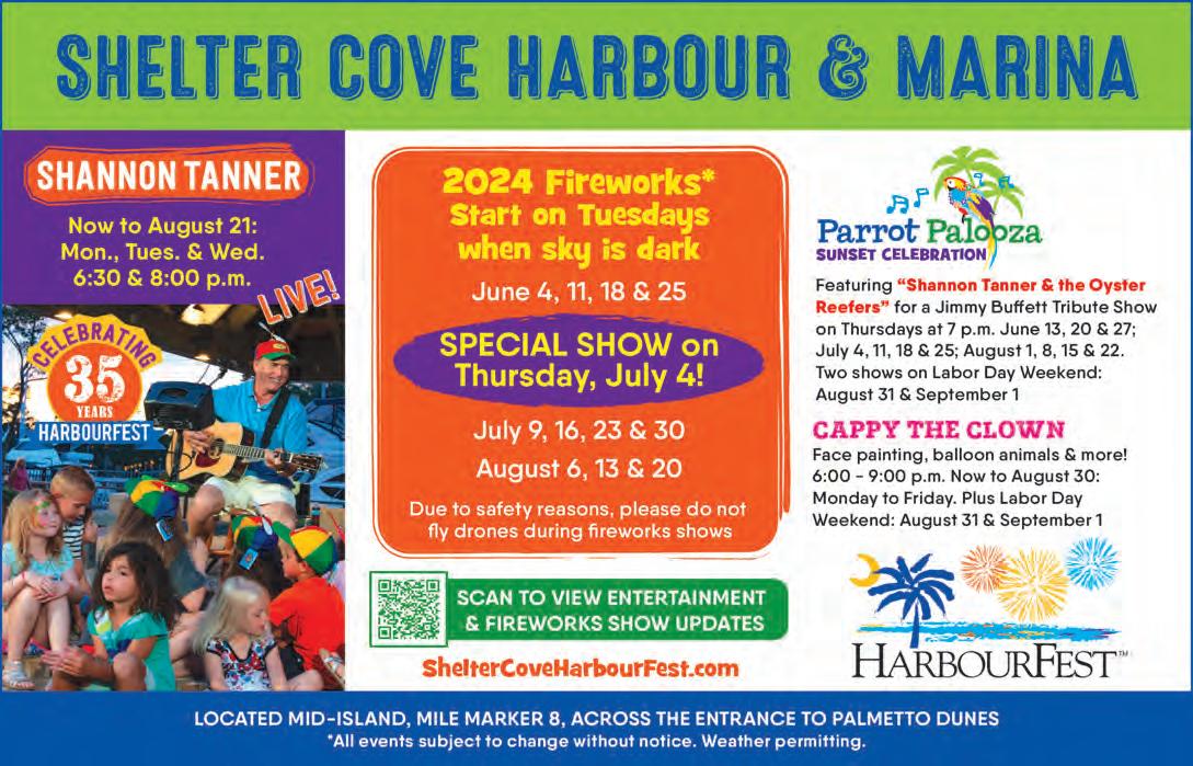6 p.m. Tuesdays, Shannon Tanner, Cappy the Clown. Fireworks at dusk ShelterCoveHarbourFest.com FUN IN THE SUN FOR EVERYONE! 9 a.m.-noonSpecial needs beach activities at Surf Watch pocketsfullofsun.org