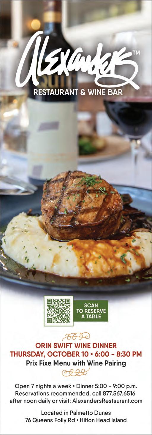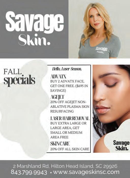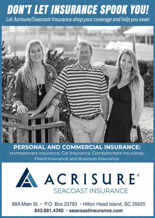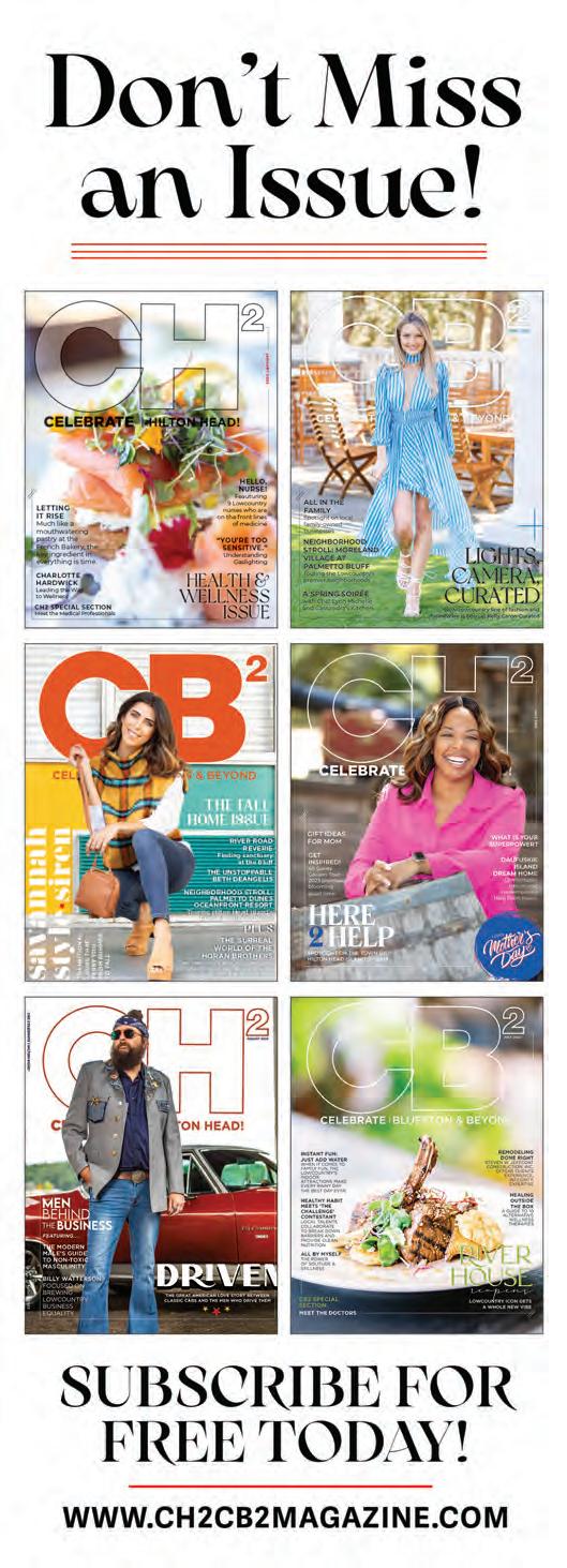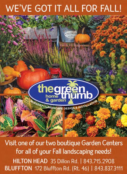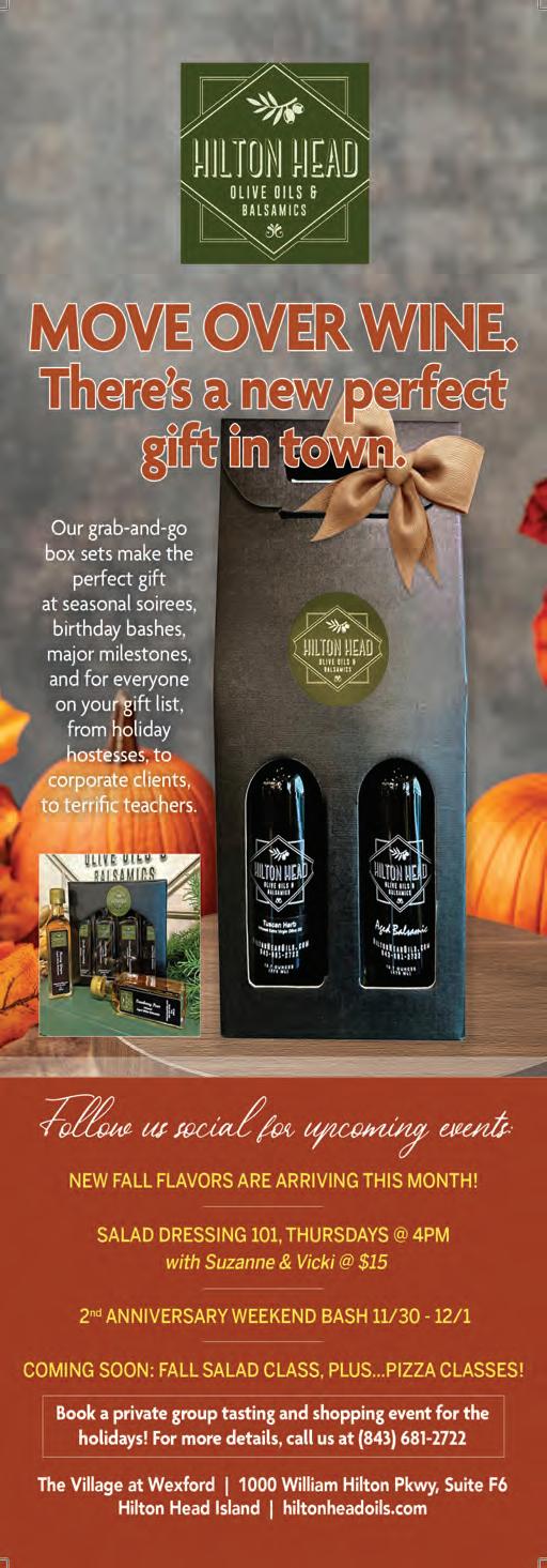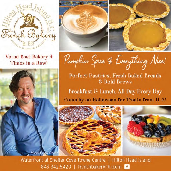 The Town of Hilton Head Island also kicks off its salute to arts and music in October, with Crescendo, a month-long celebration of culture. Barry Kaufman gets the dish from Director of Cultural Affairs Natalie Harvey about the exciting lineup of events, culminating with the highly anticipated and very well-attended Lantern Parade on November 23. See page 61. A word to the wise – PLAN AHEAD to attend this year’s Lantern Parade and leave early to account for parking and transportation to the beach. It will be on the Saturday before Thanksgiving again, so it will be a busy traffic day as our visitors arrive for the holiday week. This is always one of my favorite issues, and I’d like to give a shout-out to my sidekick, Jevon Daly, who curated a lot of this content as our famous local musician on staff. Please follow us on Facebook and Instagram for behind-the-scenes videos on a lot of this content, and up to the moment coverage on festivals happening all month. Cheers to all my pumpkin-spiceloving besties! Let’s break out the sweaters and boots and celebrate FALL. (and see Heather Quinn’s article on page 135 for ways to do that!).
