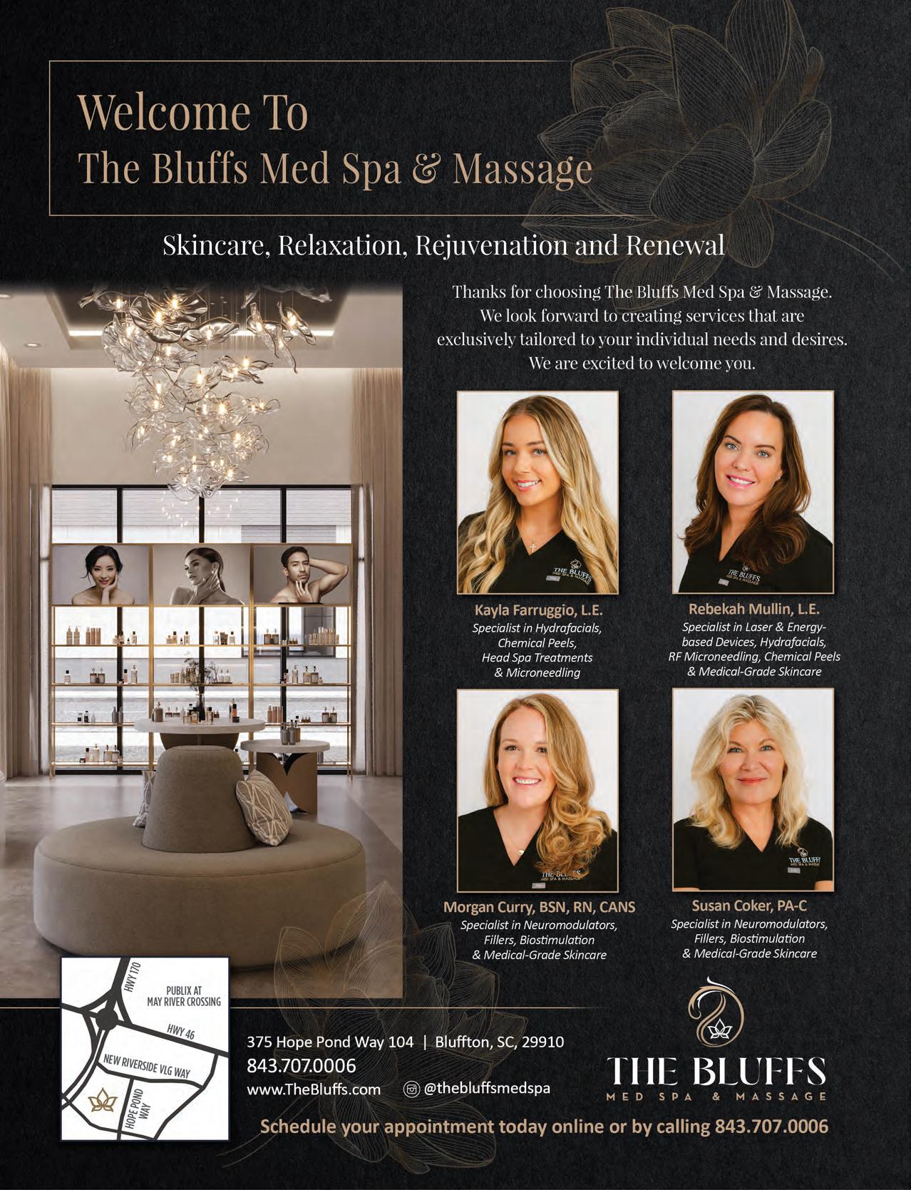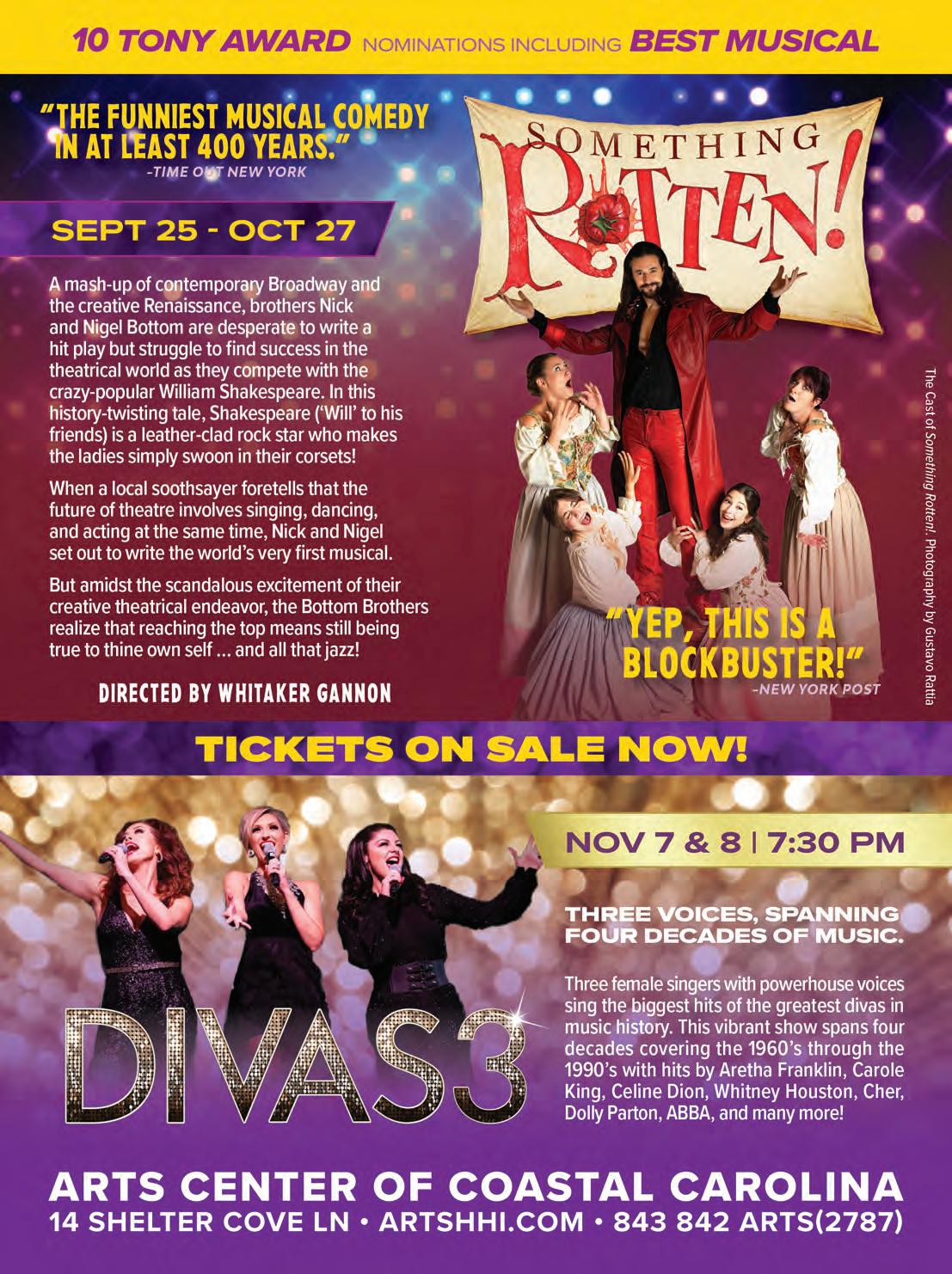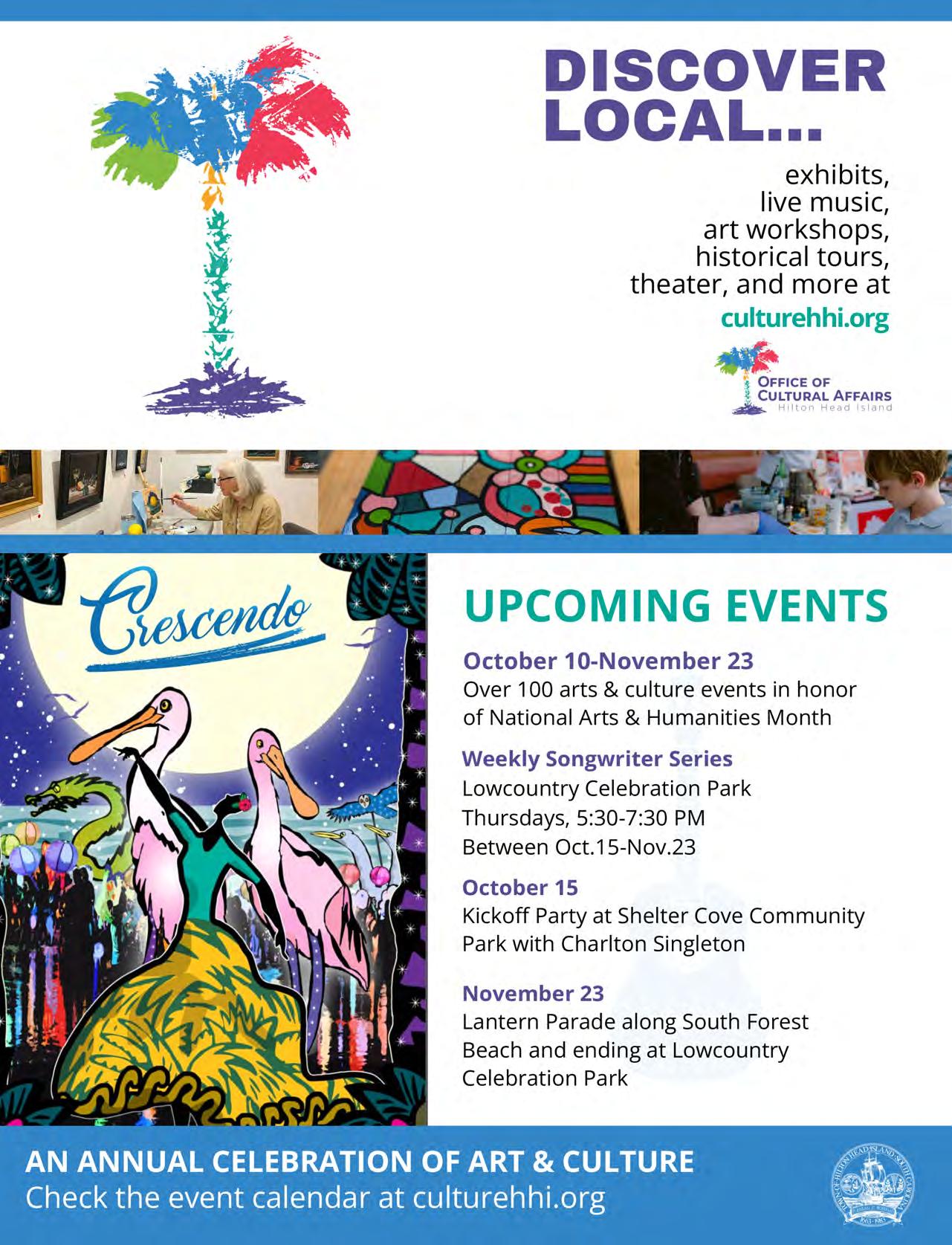 And speaking of fall festivals, we have coverage on a few, including Coligny Plaza’s Rock ’n’ Ribs (see page 141) and the 14th annual Italian Heritage Festival (page 145). Let’s not forget Bluffton’s big Arts & Seafood Festival, happening this month. Check out their ad to the right.