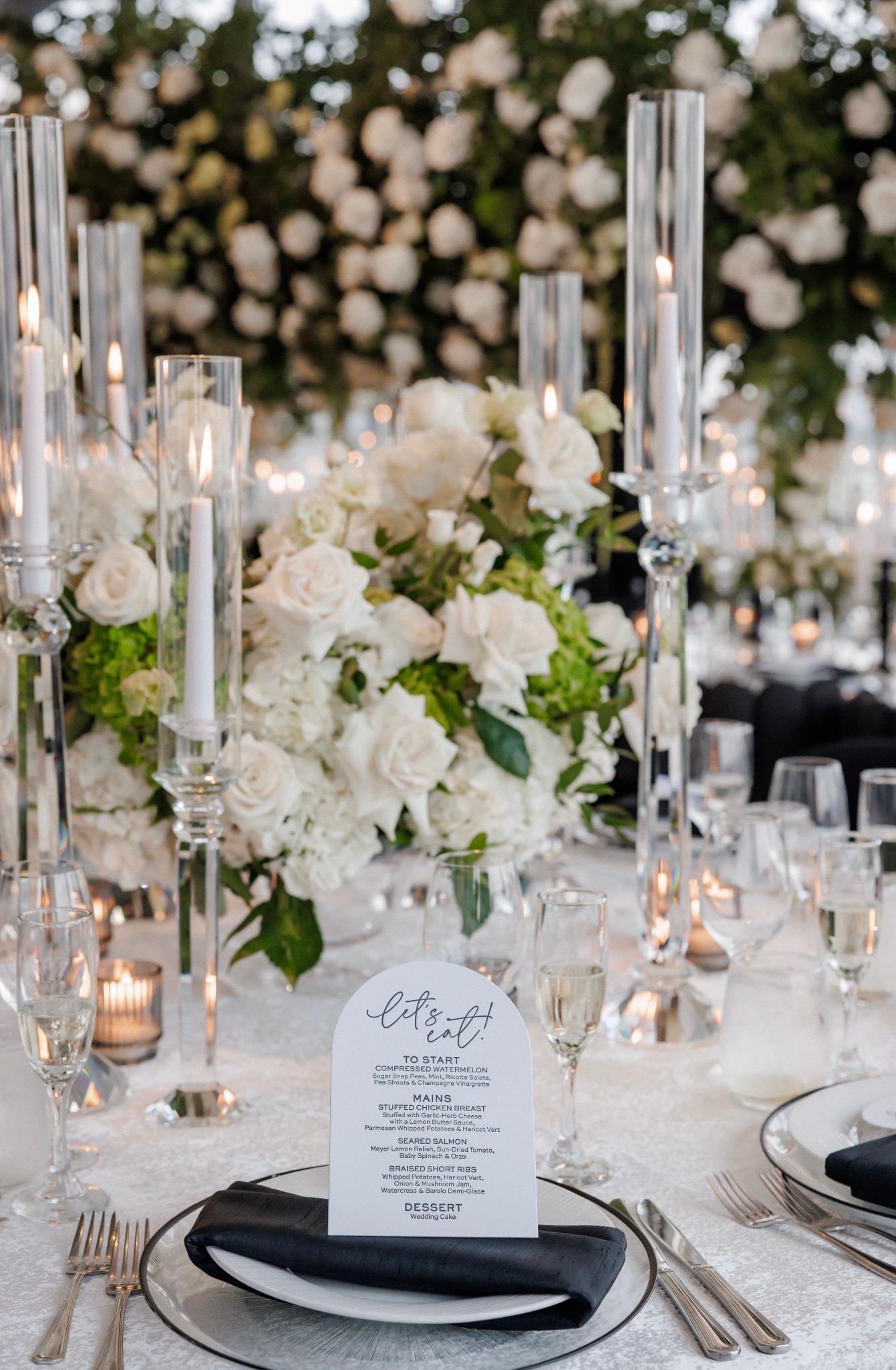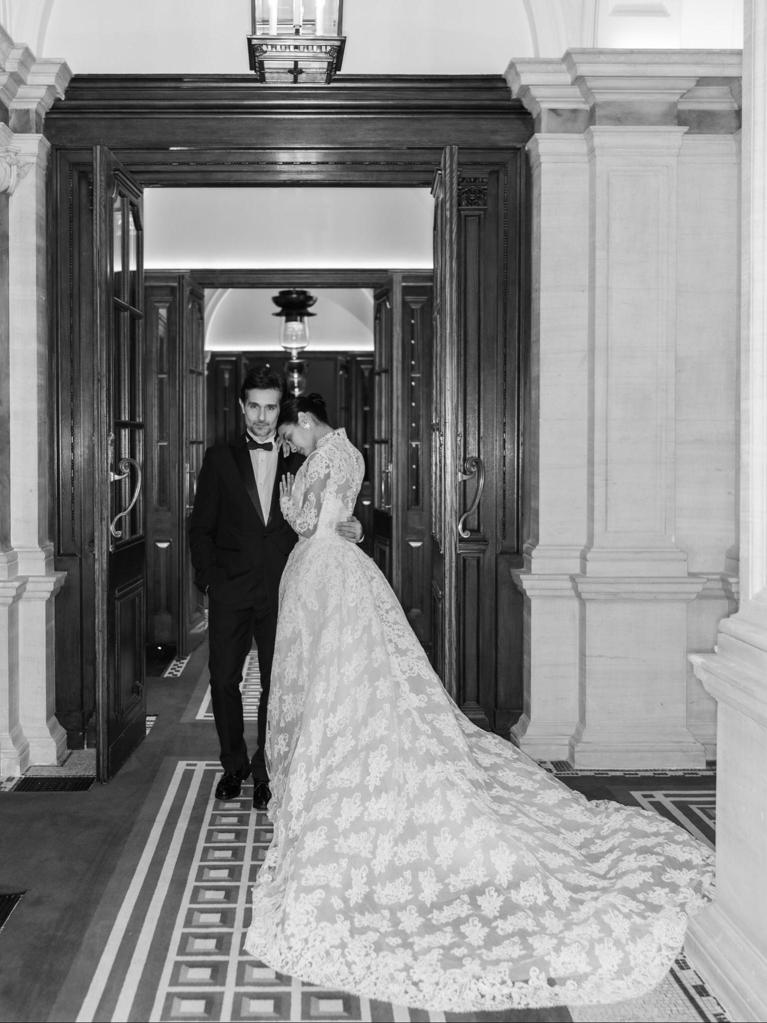 Photography: Maddy Christina Photography | Venue: Raffles London at The OWO | Planning & design: Luxus Events | Videography: Laurent Rostaing Films | Dresses: Monique Lhuillier | Floral design: Blooming Haus | Beauty: Marie Bogaert | Cake: By Yevnig | Bridal accessories: Megan Therese Couture | Stationery: Ink and Paper Design | Decor & furniture: Options Greathire | Linens: Casa Di Gaia Models: Sarah Guerre, Danea Panta, Davide Infantino