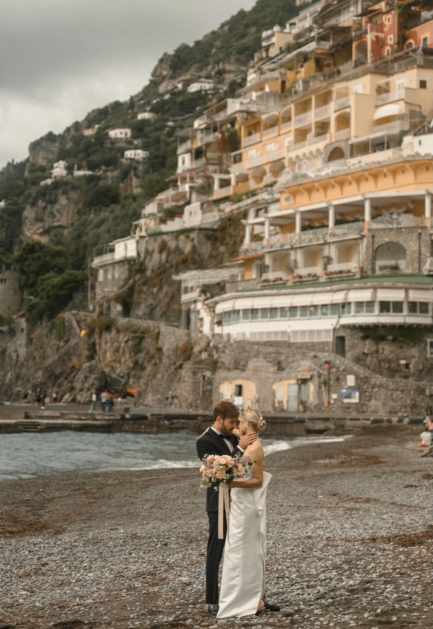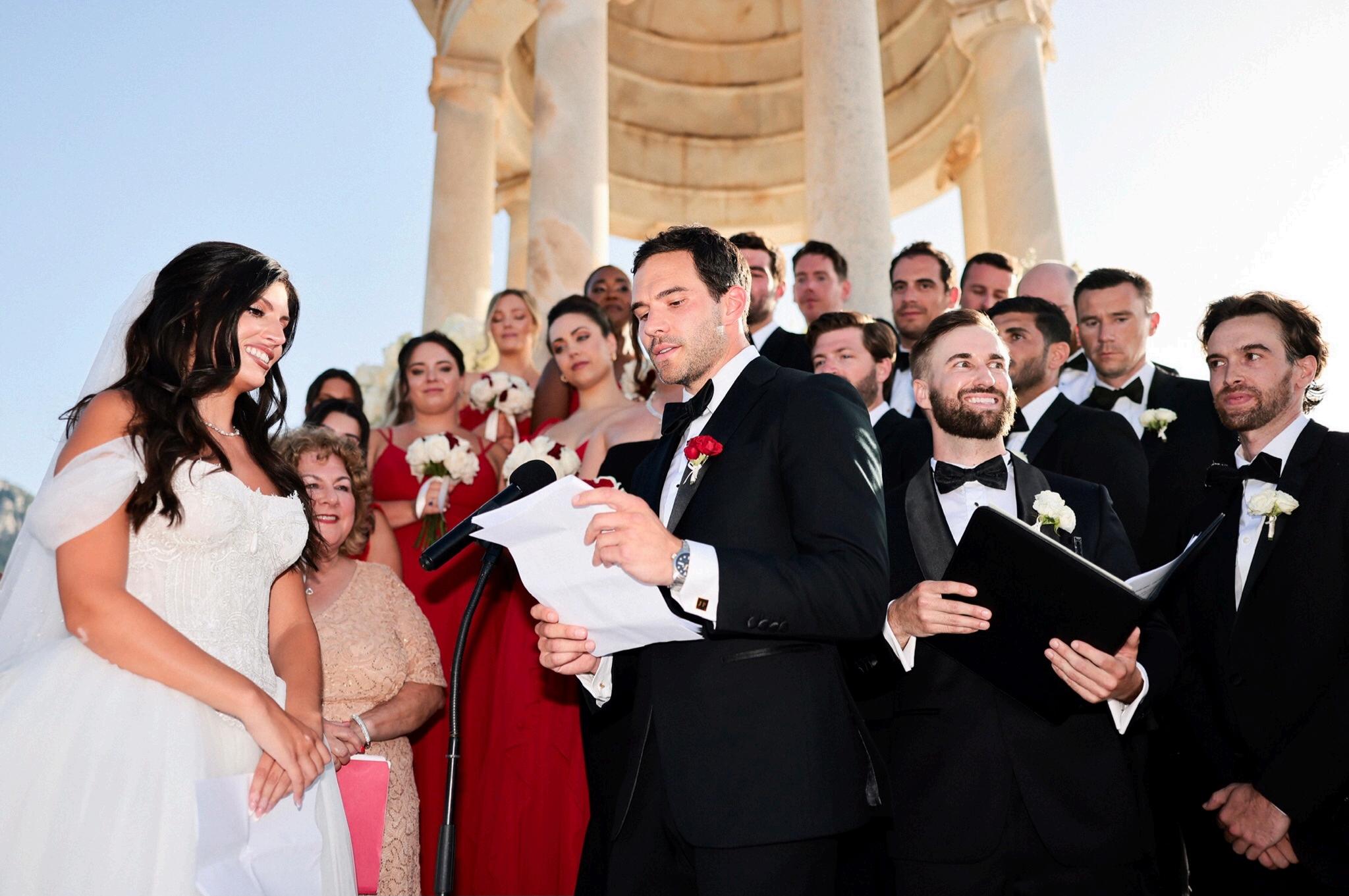 “We were torn about having a first look, but it ended up being the most special moment! As I was by myself with my thoughts, looking out at the vast sea and mountains, hearing the violin playing our song, and a mountain goat making its ‘bahh’ noise, I was overwhelmed with gratitude.… And then turning around and seeing the most beautifully stunning bride, I was blown away. She looked like an angel on earth and the fact that we got to enjoy a few minutes together just us, basking in the special day and the amazing moments to come, I’ll forever cherish those moments.” —Jackson
