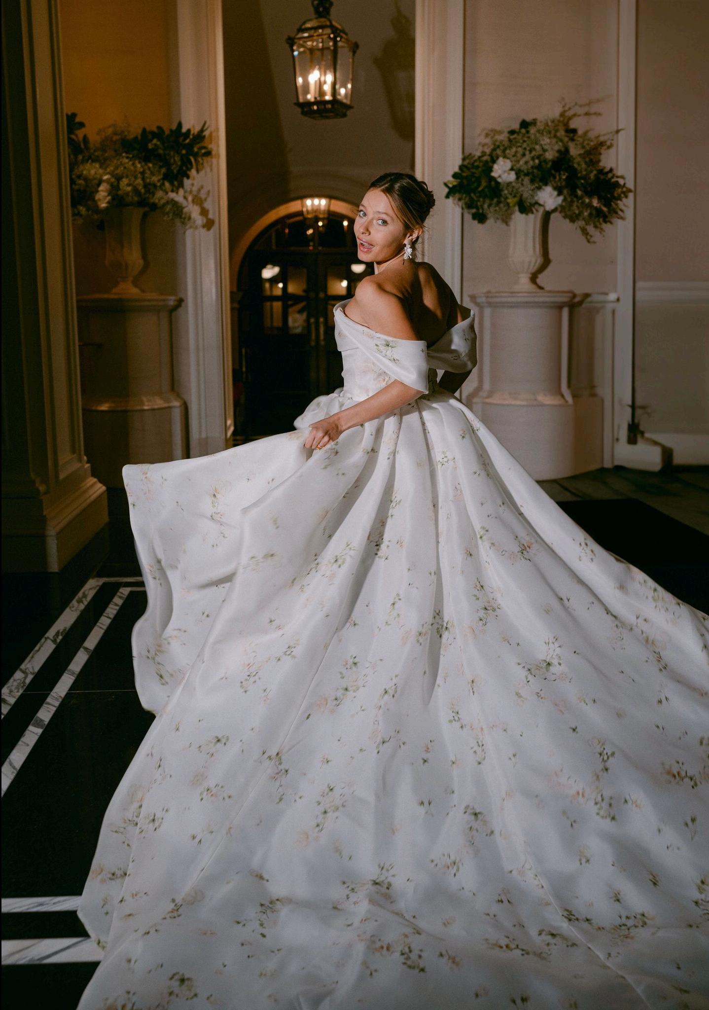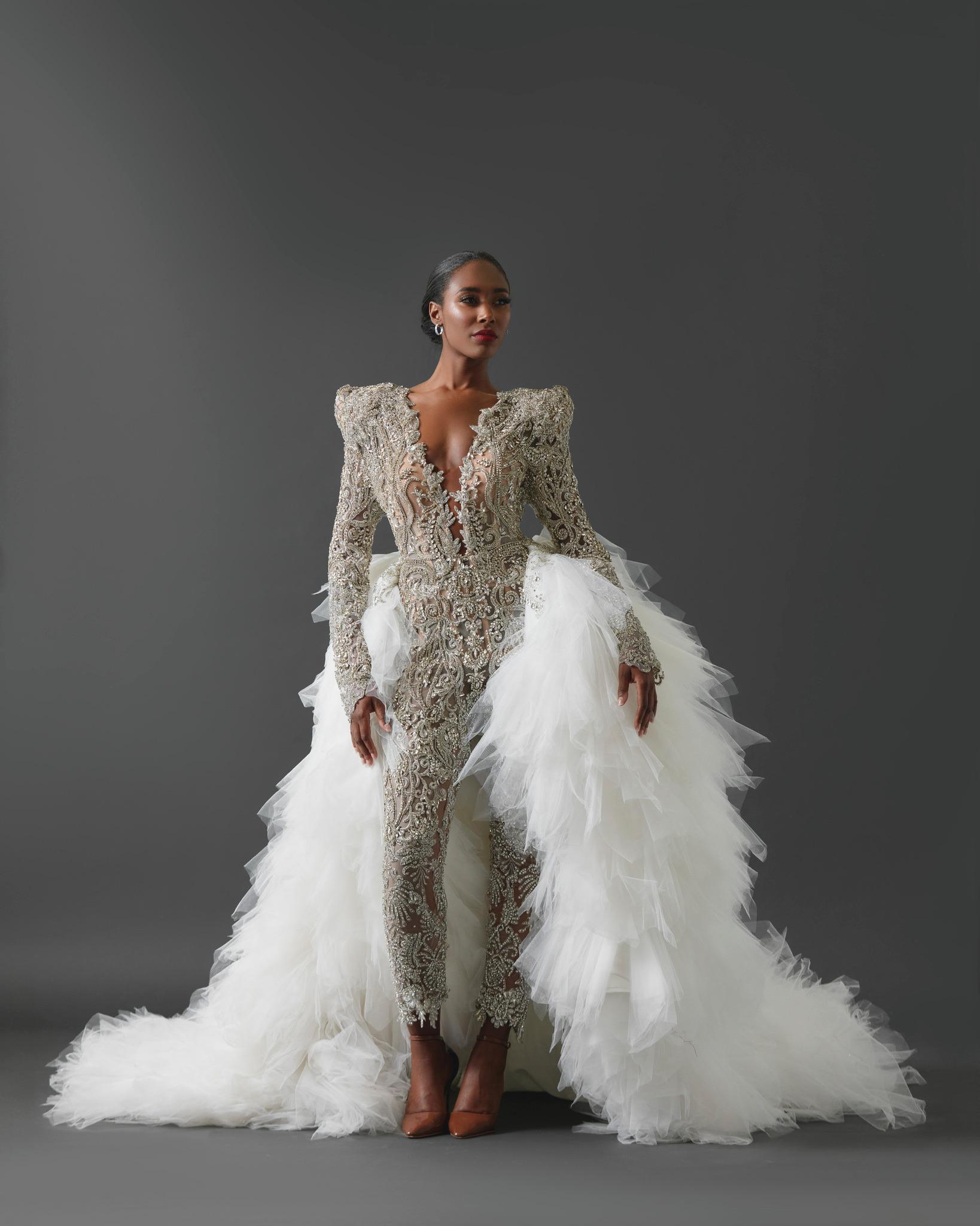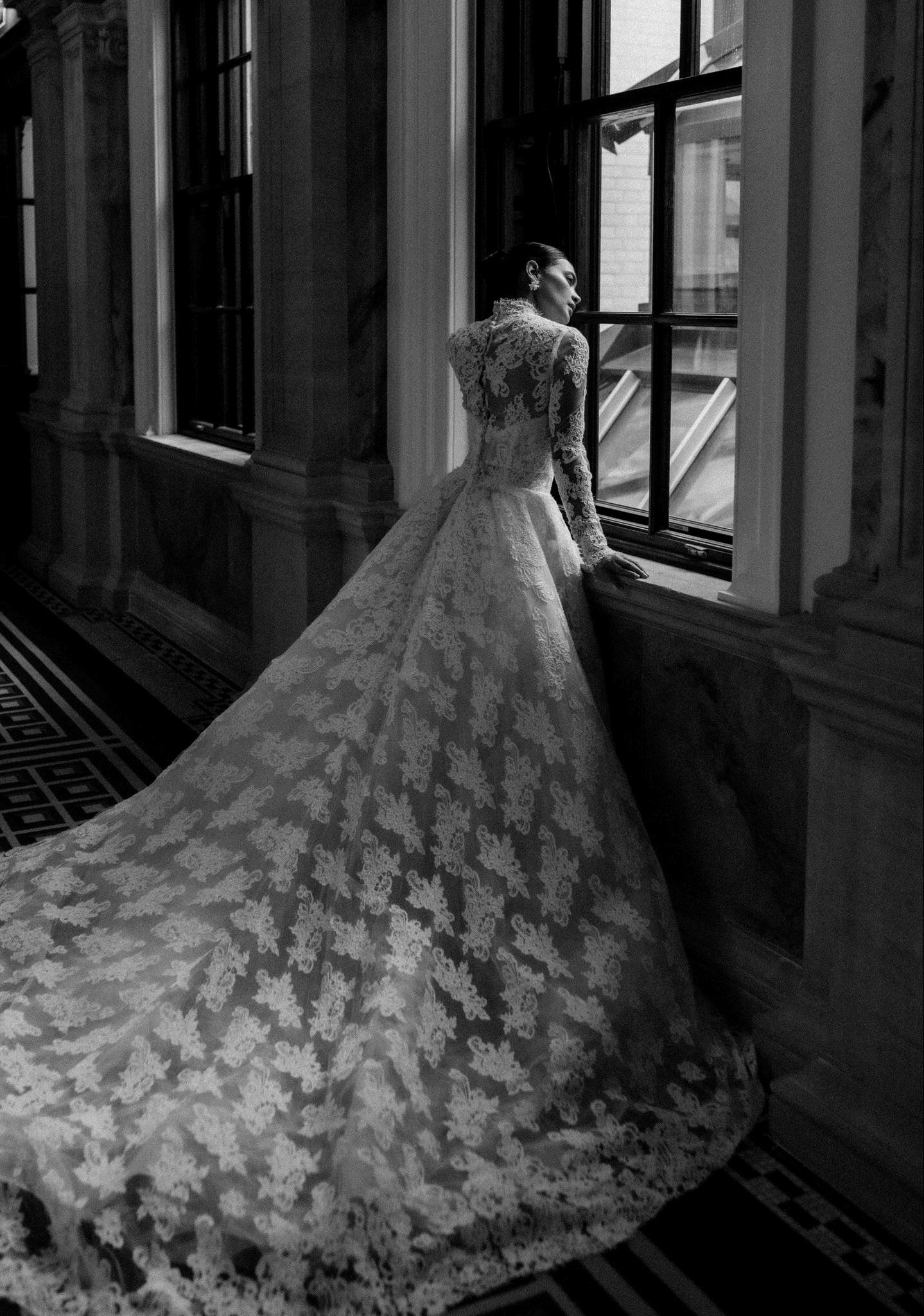 Nocturne Symphony is a collection inspired by the night and designed for the bride who dares to dream. This season begins with our signature modern seaming and structured corsets, harmonizing with unexpected elements like exaggerated basque waists and couture volume. As the collection crescendos, it introduces gowns adorned with intricate 3D florals, laser-cut appliqués, and rich floral jacquards and brocades. Silver crystal diamantes, pearls, and corded Alençon laces add a touch of brilliance, encouraging our brides to dazzle. The Fall/Winter 2025 collection is a beautifully orchestrated composition of artistry and design.