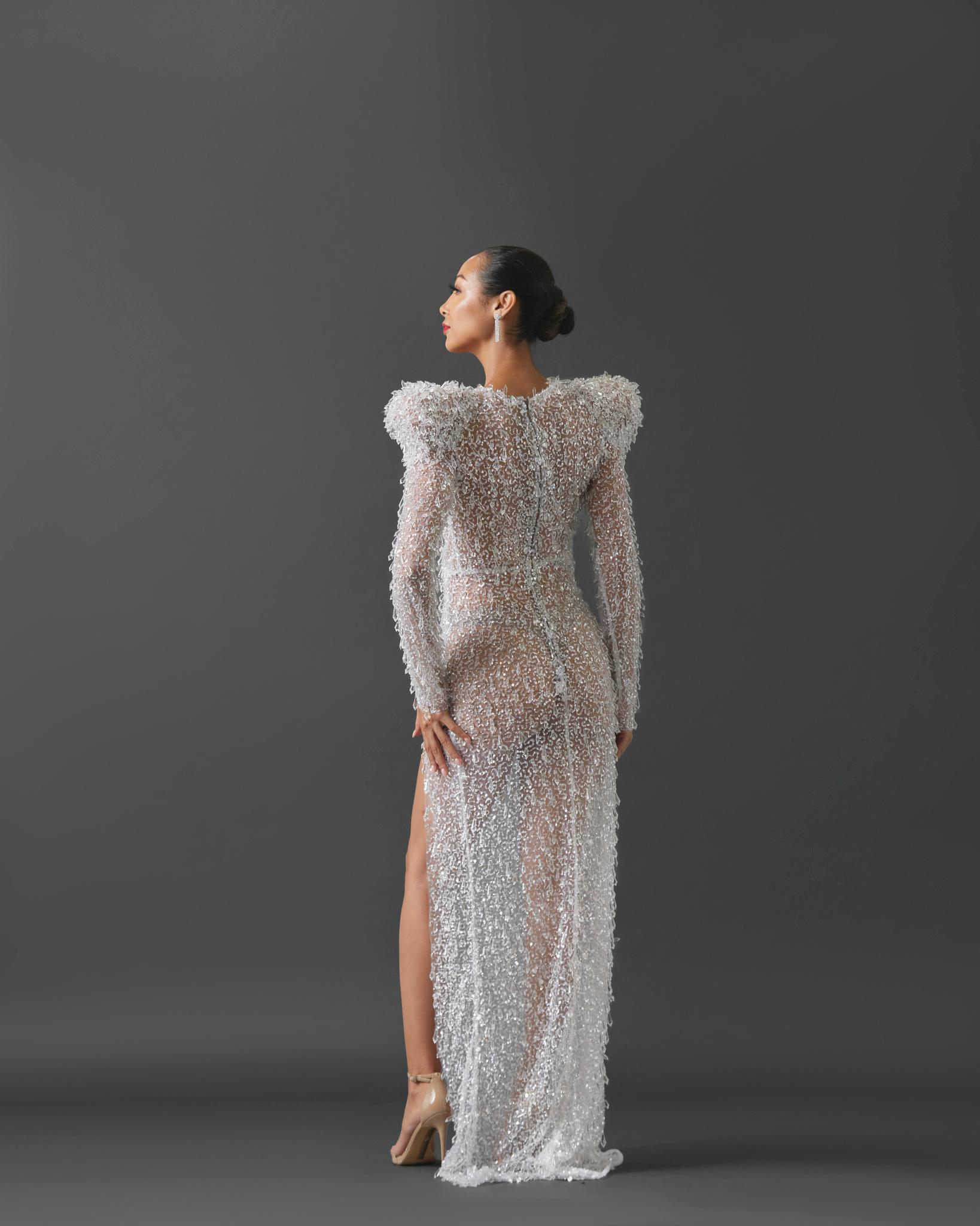 Sheer column gown with a high slit and deep V in neckline. Gown features long sleeves and exaggerated, structured shoulders.