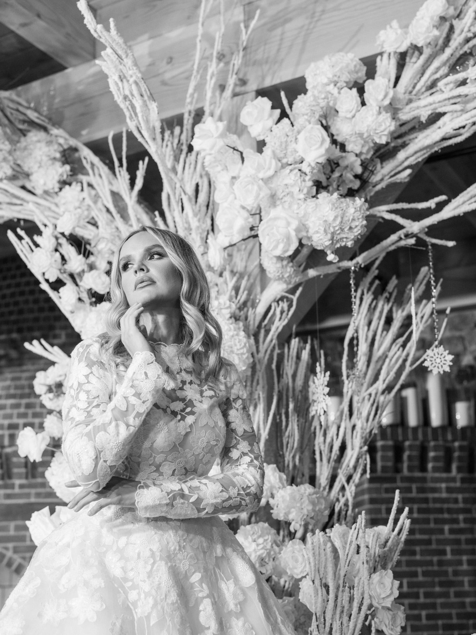 “The setting was designed to evoke a dreamy winter landscape with a backdrop of ivory florals adorned with delicate hanging snowflakes and abstract ice formations. The bride model wore a beautifully detailed Demetrios lace dress, re fl ecting this season’s trend of elegant lace gowns paired with statement veils, adding a touch of timeless romance. For a pivotal moment in the shoot, we added DJ sparklers and a dancing on a cloud effect to represent the magical first dance. The groom model’s burgundy suit provided a warm contrast to the cool, wintry setting, completing this enchanting capture of a winter wedding,” says Donia, owner and photographer with Donia Wedding Arts.