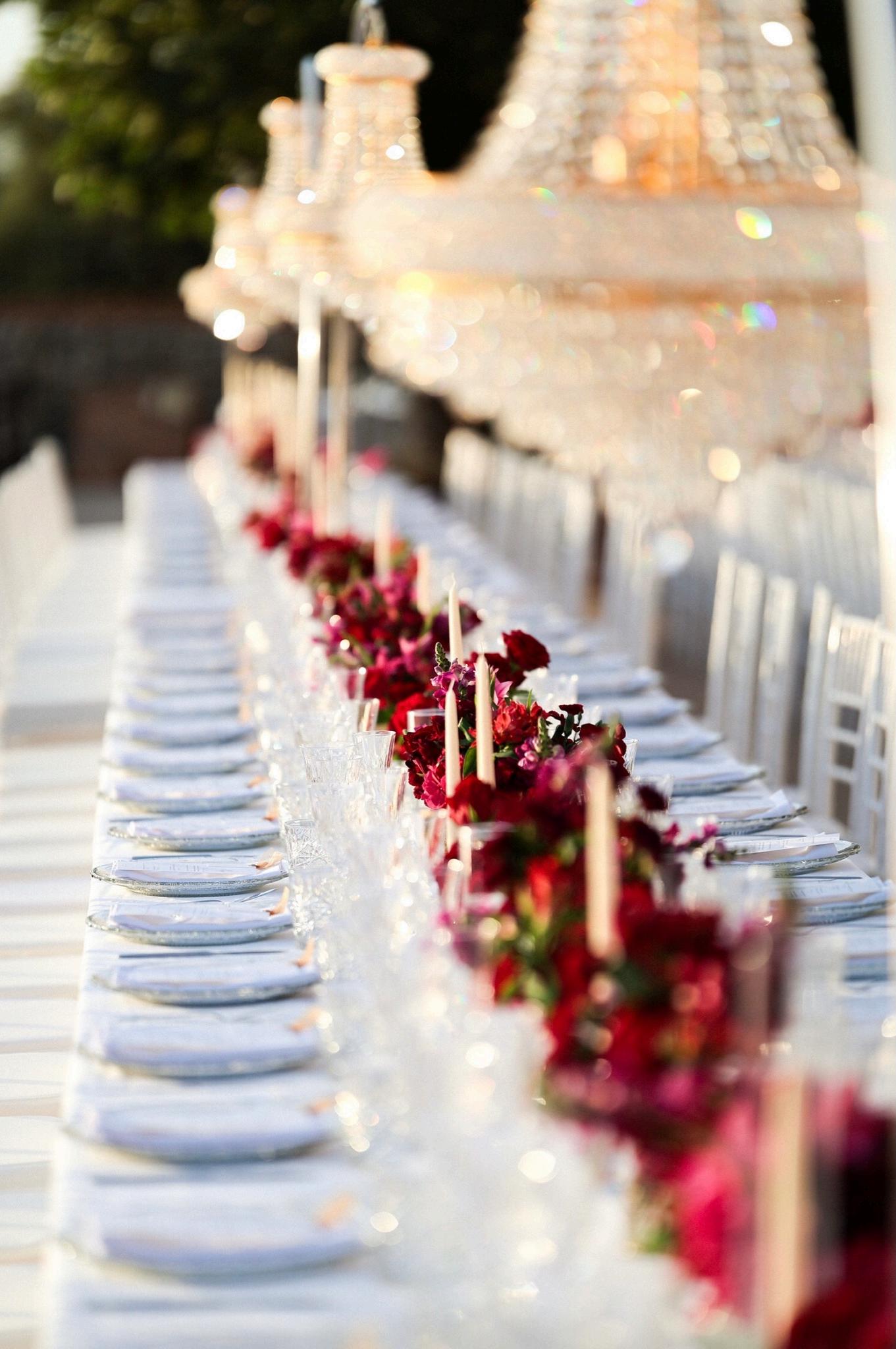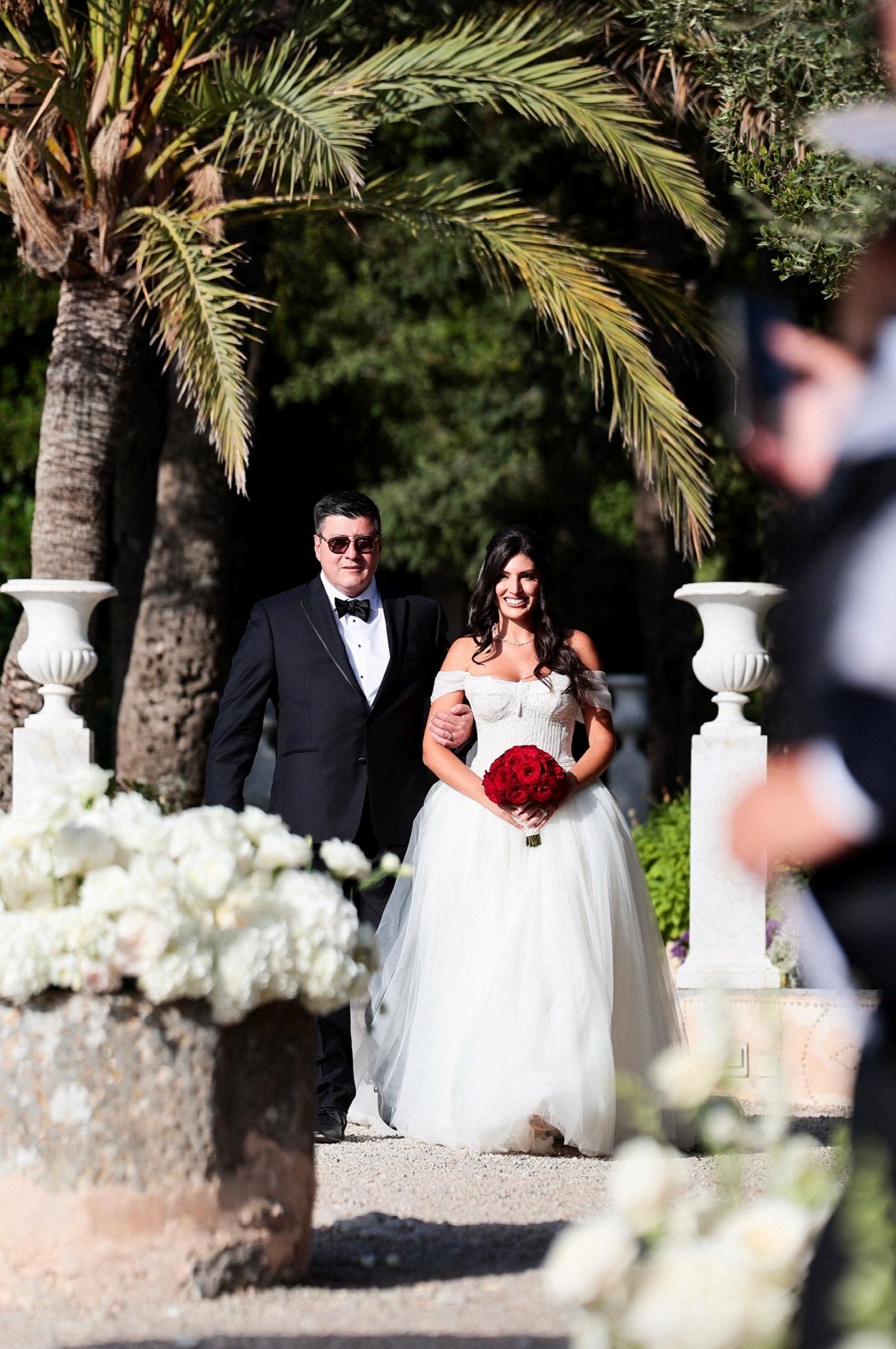 This romantic wedding in Mallorca, Spain was all about the roses, Rosana’s favorite. Incorporated into every aspect of the decor, the roses were big and beautiful. The biggest, though, were the white roses, flowers found in the mother of the bride and groom bouquets. Although, for her bouquet and the multi-tiered classic, vintage-style cake, Rosana chose red but opted to mix red and white for her bridesmaids. For her dress, Rosana wore custom Kim Kassas, her first pick for a designer. Picking the “Ines” dress, she customized it to create a basque waist, add romantic off the shoulder tulle sleeves, and extend the train by three yards — all of which took about a year to finish altering.