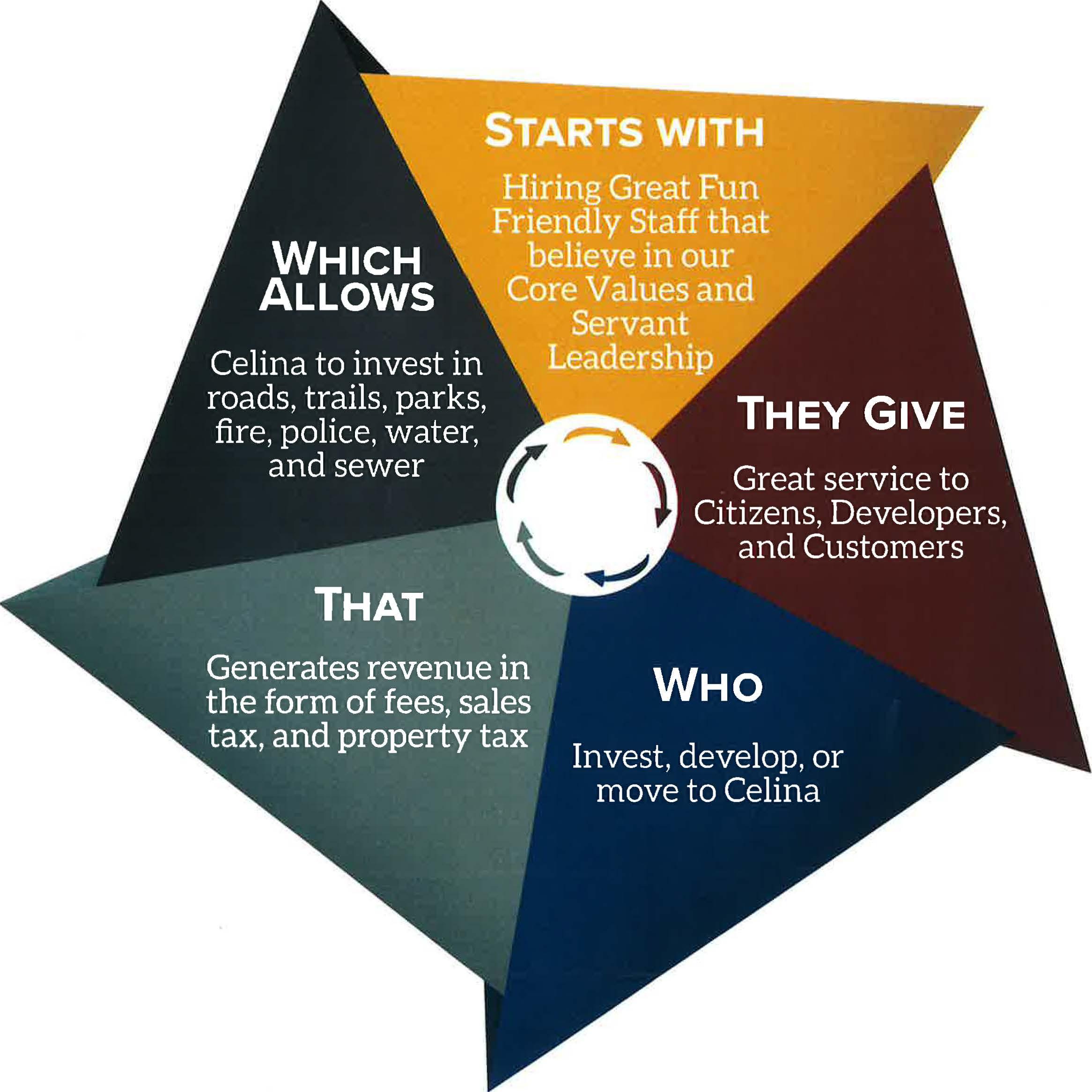 The City of Celina’s internal core value system stems from the philosophy of Servant Leadership and the belief that as public servants, all actions stem from the obligation to put the needs of the residents first and dedicate our decision making and actions to the ideal that City employees exist to serve the people. These Core Values represent our highest aspirations, our moral code and what we are deeply passionate about.