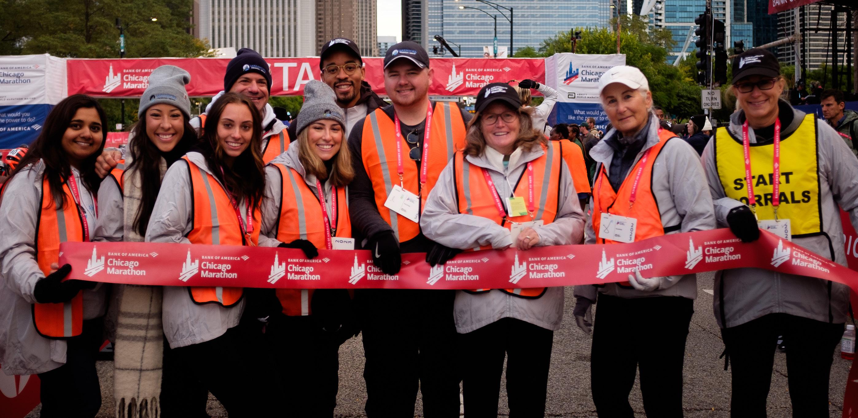 Every year, 10,000 volunteers lend their time to make the Bank of America Chicago Marathon great. Volunteers play a critical role in the event’s operation, starting weeks before race weekend with packet preparation before serving as the main point of contact for participants at the Abbott Health & Fitness Expo. On race day, volunteers fulfill an impressive range of roles, providing guidance as information team members, helping maintain start corrals, distributing fluids and supplies at aid stations, assisting those who need medical attention oncourse and in Grant Park and handing out medals and runner refreshments after the race. The Chicago Marathon truly could not take place without each and every one of our volunteers. Thank you, volunteers, for all the help you provide!
