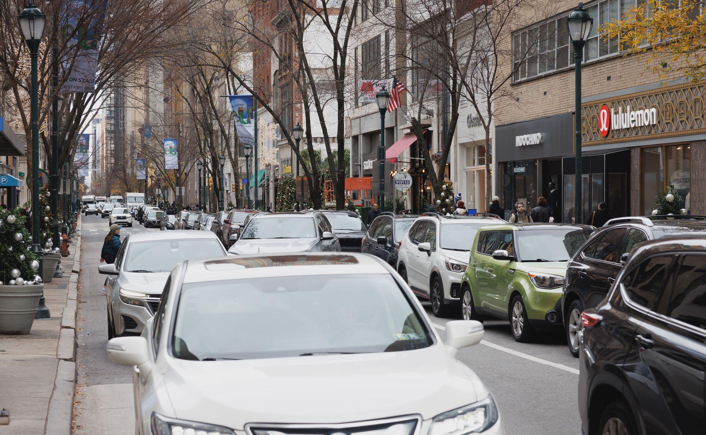 Picture Rittenhouse Row on a typical Sunday morning. People fill the sidewalks, browse Anthropologie, Philadelphia Runner, or the Apple Store, people-watch over brunch at one of Parc’s coveted sidewalk tables facing Rittenhouse Square. Yet, despite the retail activity and sidewalk animation, two-thirds of the space between buildings is allocated to vehicular storage and movement rather than the foot traffic that is generating commercial revenue.