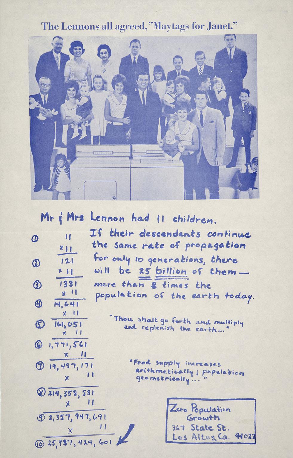 Wealthy people living in highly developed countries use a disproportionate amount of the world’s resources. Thus, they contribute disproportionately to climate change. This poster appropriates a Maytag advertisement from 1968 that features Janet Lennon, member of the vocal quartet known as the Lennon Sisters, and her 11-sibling family. The original advertisement boasted that it was a Lennon family tradition for each sister to receive a Maytag washer and dryer set as a wedding gift. The poster, created by Zero Population Growth (which changed its name to Population Connection in 2002), questions the effect that large, consumer families such as the Lennons will have on the planet within a few generations.