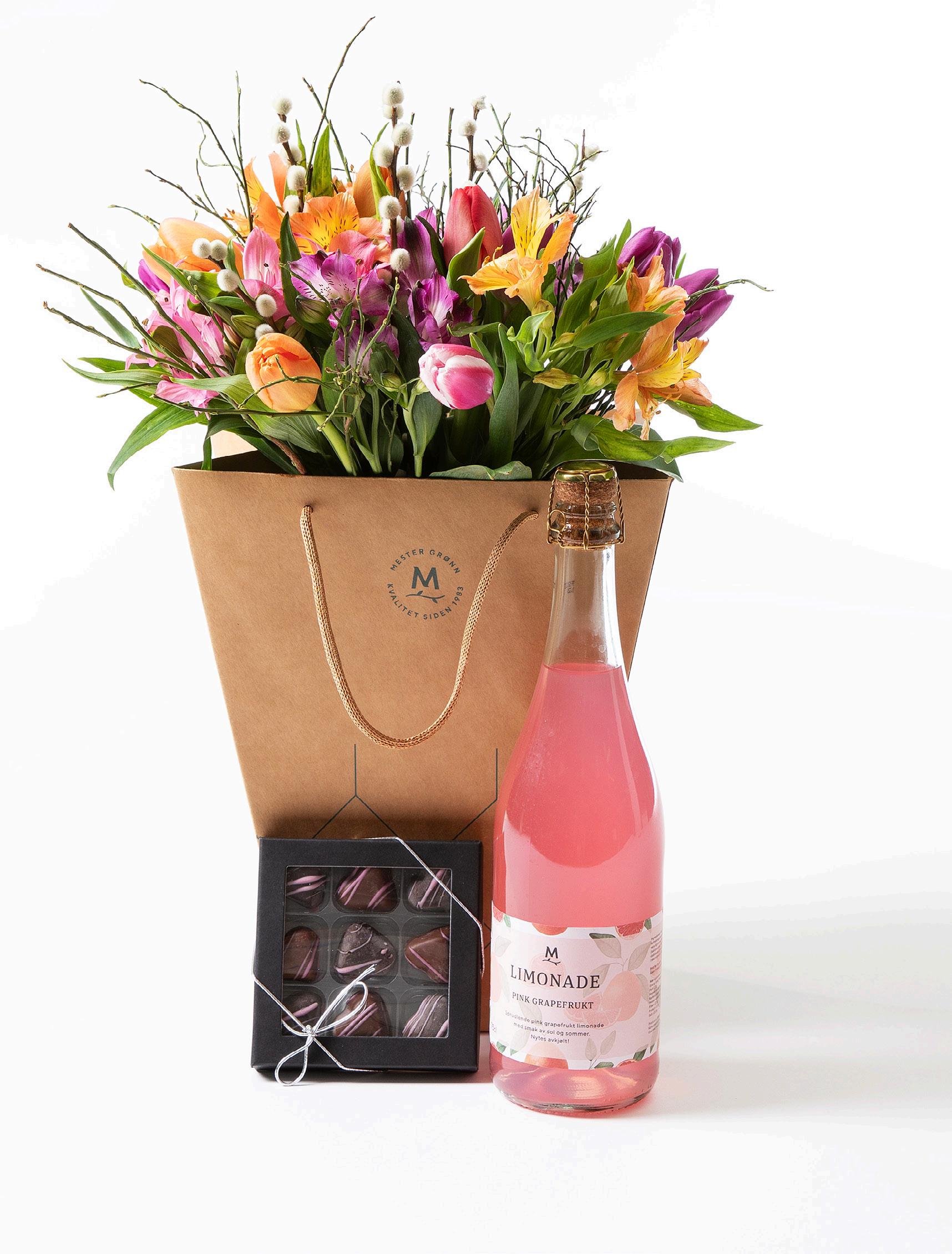 Tulipanbukett i gavepose 380,- Limonade 100,Konfekteske 120,-