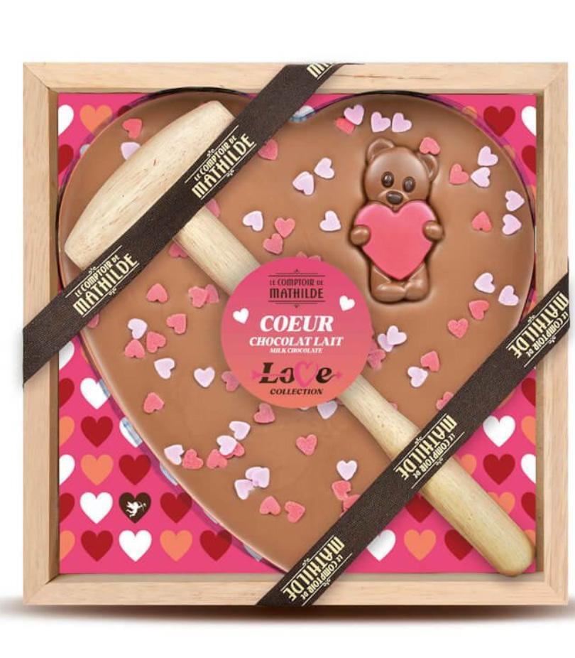 Et stort hjerte av melkesjokolade dekorert med små rosa sukkerhjerter og en søt liten teddybjørn med et rosa hjerte. Presentert i en treramme med en hammer av tre for å brekke opp sjokoladen.