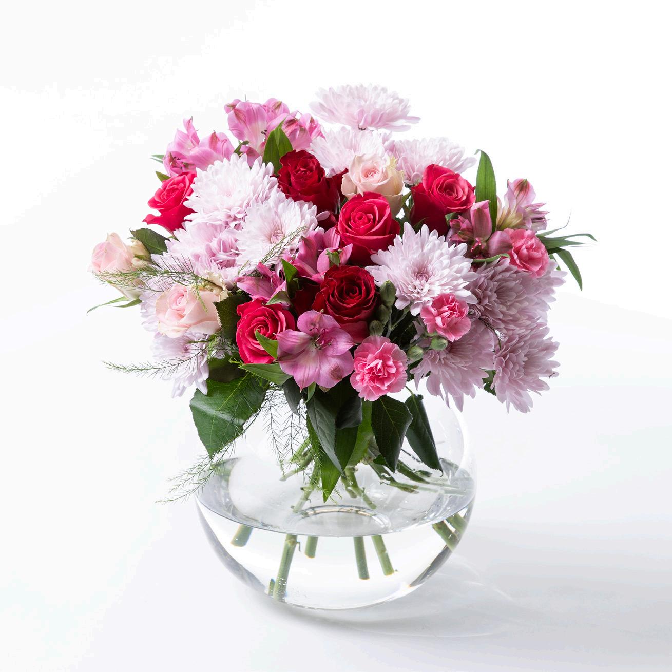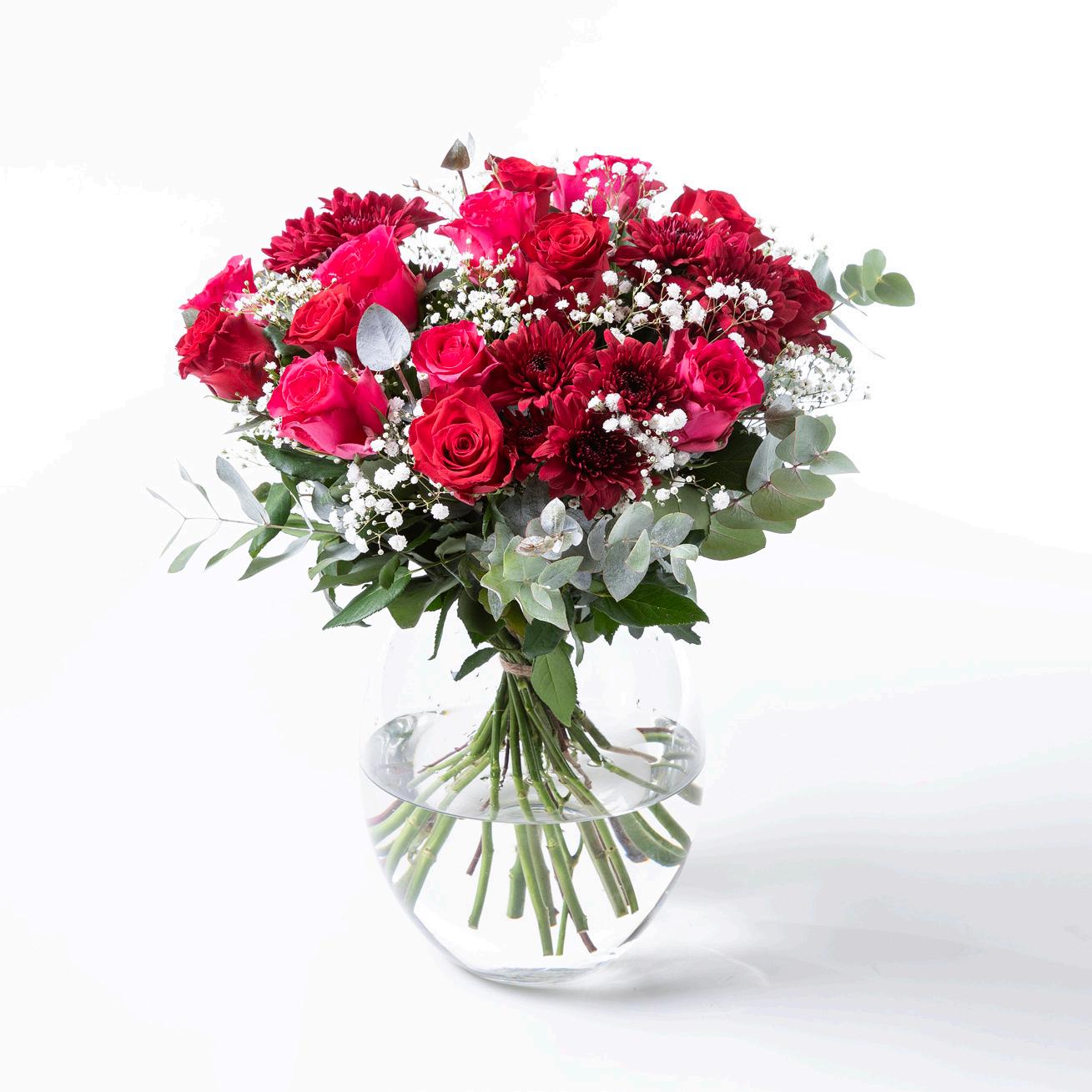 Bukett med roser og krysantemum