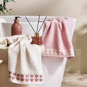 Mellomtykt frottéhåndkle med broderte hjerter langs borden 50x90 cm rosa