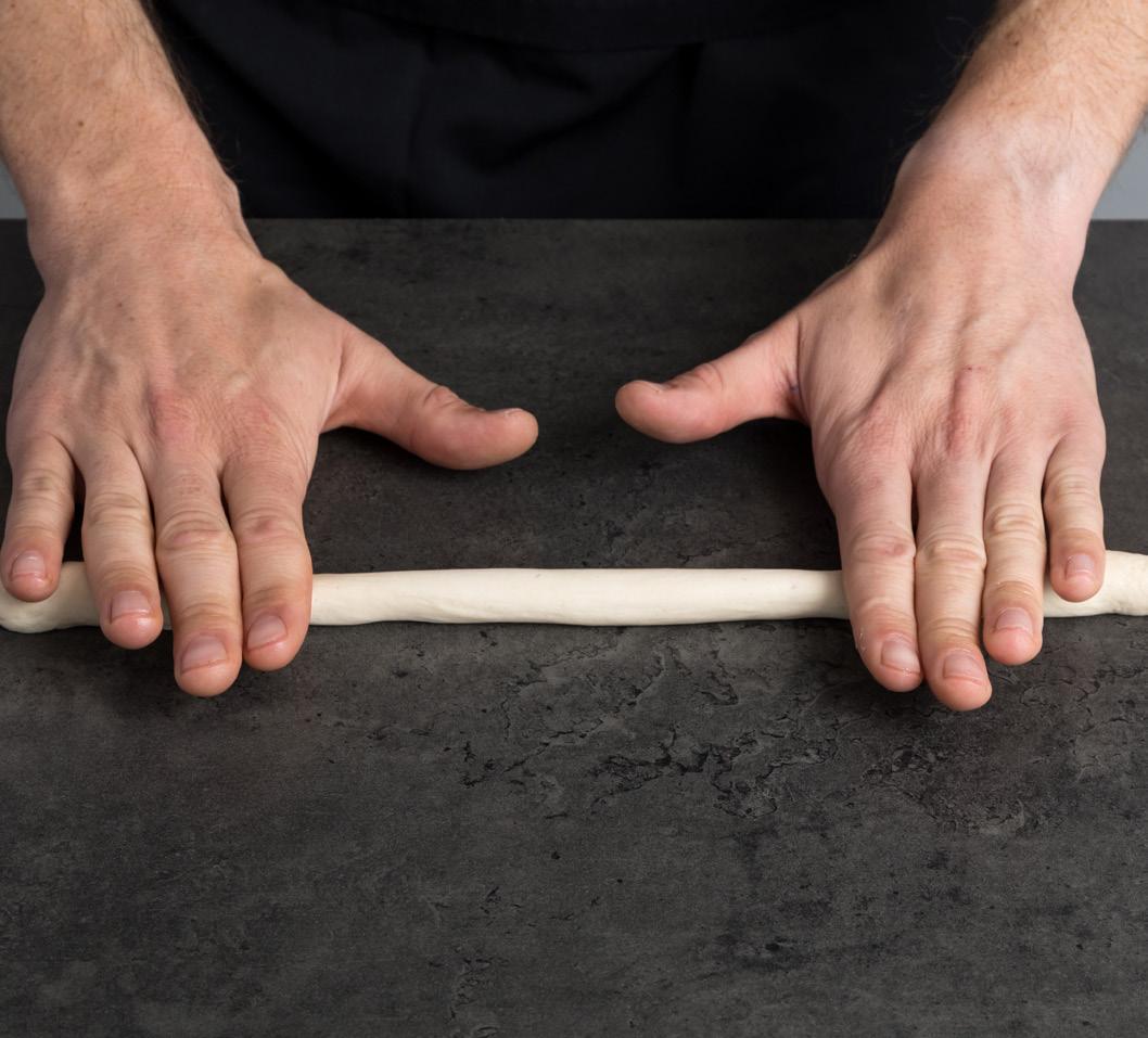 Del deigen i tre deler som igjen deles i tre like store emner. Rull så emnene til pølser og flett sammen.