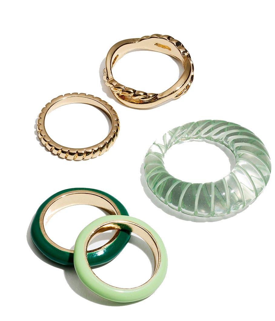 Gullfargede ringer med detaljer i grønt og harpiks, 5-pakning