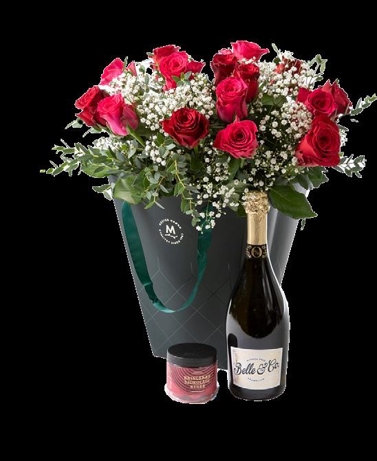 Mester Grønn Eksklusiv rosebukett med brudeslør i gavebag (fra fredag uke 6) 680,Musserende alkoholfri drikke 100,Sjokoladekuler 70,-