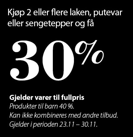(Gjelder fredag og lørdag. Gjelder ikke allerede nedsatte varer og kan ikke kombineres med andre tilbud.) -30% -20% 3 for 2 TILBUD 28. NOVEMBER