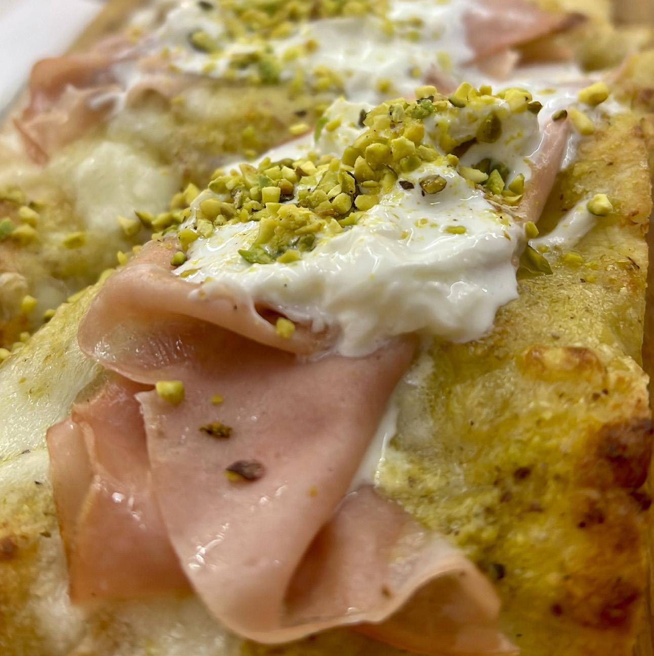 Hjemmelaget parmesankrem, mortadella med pistasj, burrata og pistasjnøtter