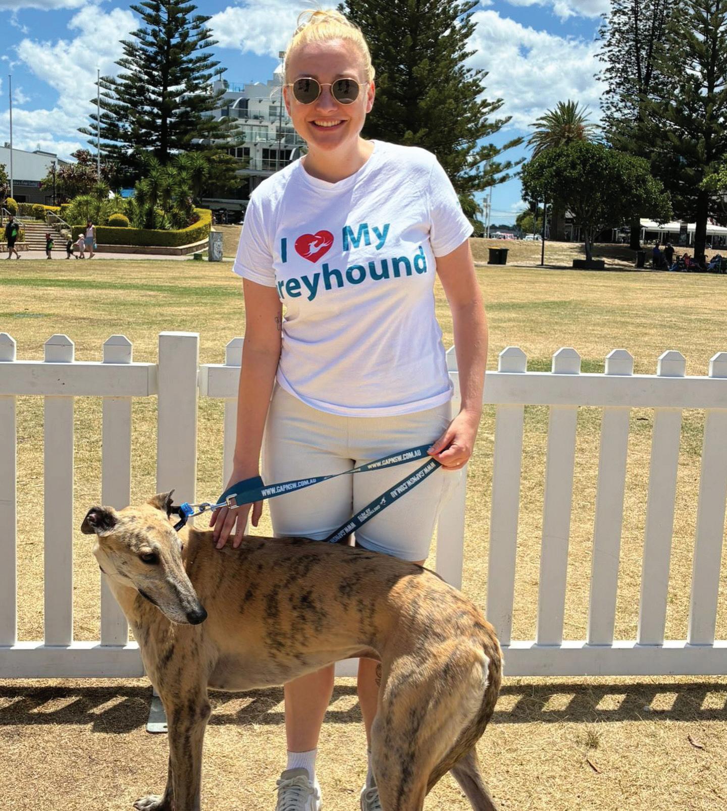 Shezarne Cuffe, Greyhounds As Pets volunteer, with greyhound Bossy