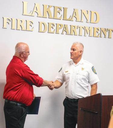 Lakeland Fire Chief Doug Riley recognized a local citizen whose brave actions helped rescue a victim trapped within a burning vehicle. Glenn Chancey sprang into action while at work to perform an extraordinary act – assisting another in a time of need. He received an official Certificate of Recognition from LFD on July 13.