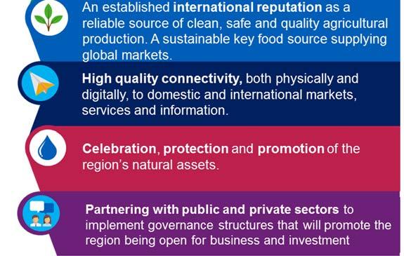 PILLAR 1: EXPORT DRIVERS 1. Promoting comparative advantage 1.1 Regional Branding 2. Expansion and diversification of existing sectors 2.1 Domestic and international market development 2.2 Expansion into high-value crops, livestock and horticulture 2.3 Exploration of by-product use 3. Energy independence and renewables 3.1 Supporting a 24/7 economy 3.2 Harnessing opportunities for renewables 3.3 Promotion and optimisation of energy comparative advantage 4. Expansion of research and development activities 4.1 Research and development activities relating to the agriculture, resources education and training and other industry sectors. 4.2 Coordinated rehabilitation and end of mine life research 4.3 Industry representation in research activities 5. Improved connectivity 5.1 Improved freight and logistics 5.2 Supply chain optimisation 5.3 Increased digital capacity and reliability 6. Increasing the ease of doing business 6.1 Connectivity to markets 6.2 Small business support and education 6.3 Core business sharing agreements 6.4 Innovation and start-up incubation 7. Stability and rehabilitation of the resources sector 7.1 Effective and formalised lifecycle planning in collaboration with the resources sector. 8. Optimising water trade, security and capacity 8.1 Water supply optimisation and ongoing supply certainty and reliability 8.2 Leverage resources investment 9. Increasing tourism activity 9.1 Better coordination and engagement to support growth and diversification 9.2 Local operator capacity building PILLAR 2: POPULATION SERVICES 10. Supporting a local workforce 10.1 Supporting and promoting livability 11. Improved community investment 11.1 Targeted community investments 11.2 Multi-purpose community spaces 12. Access to and use of open data 12.1 Open and reliable data