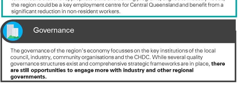 The role of CHDC as the region’s lead economic development agency will continue to be critical as will CHRC’s role from a leadership perspective, however the role of industry will be increasingly important. The region’s economic future is a priority for not just CHRC and CHDC – all members of the business community and community more generally will be impacted by the economic outcomes realised within the region in the future.