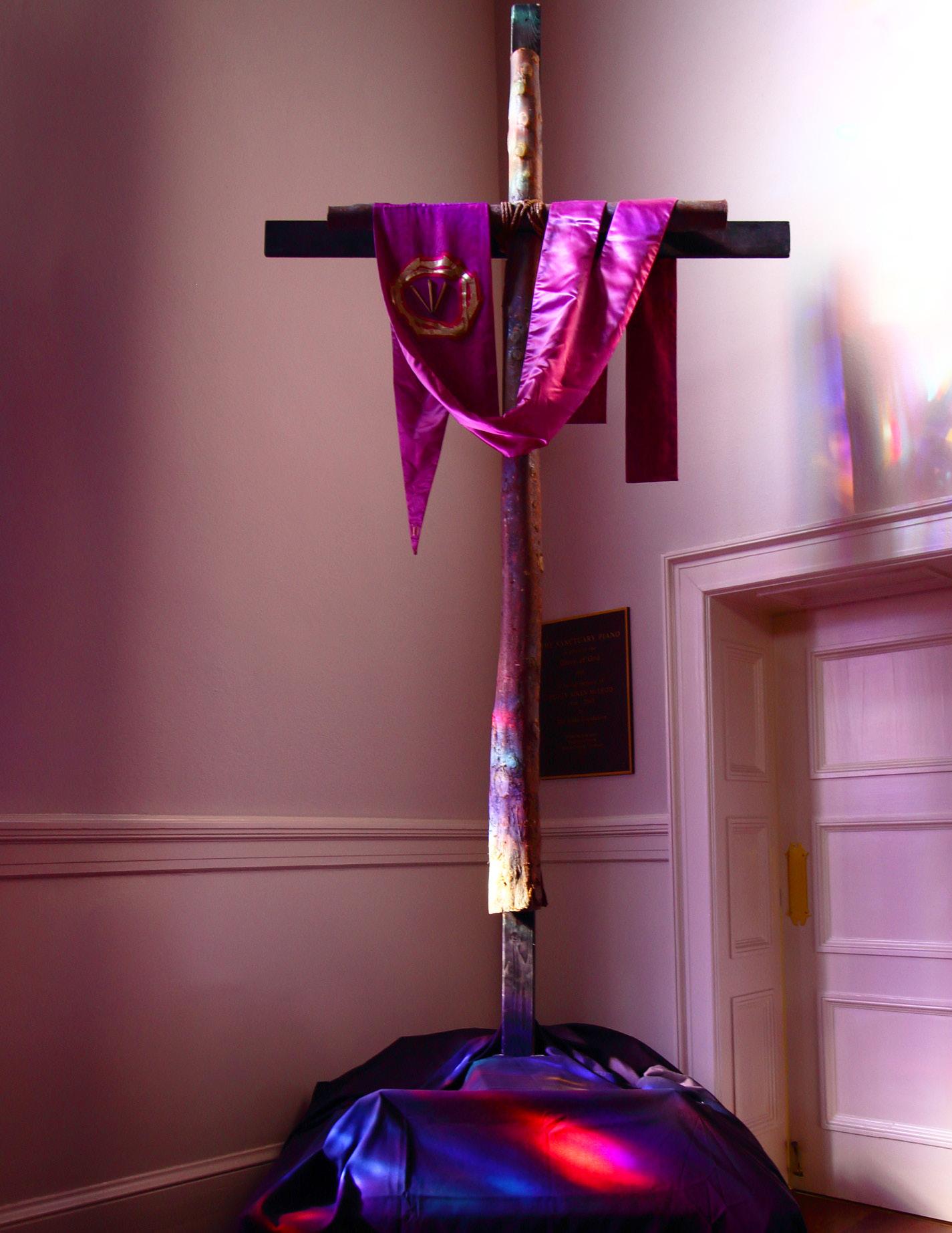 It was early in Lent 2020. I was attending the 9:00 a.m. service. As the congregation finished the hymn that precedes the sermon and sat down, I glanced over at the wooden cross Central traditionally erects during Lent, draped in the purple liturgical color of the season. As Thomas began his sermon, the colors caught my eye. I’m sure an astronomer could give us a scientific explanation, but all I know was that sunlight shown through the stained-glass windows, causing a myriad of colors to shine on the cross and wall beyond. What caused me to completely lose focus on the sermon (sorry, Thomas) was the largest blotch of color, deep blood red, that was fixed almost squarely on the juncture of the vertical and horizontal beams.