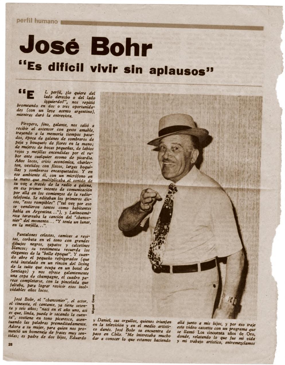 La explicación, en la que dice estar tratando de “tender un puente de plata entre Chile y España, a través de una carcajada”, describe tan bien a José Bohr como las otras introducciones, si no mejor. Sin intermediarios, se nos muestra al tipo impetuoso que hizo reír a los magallánicos con sus cortometrajes y que más tarde, tras vivir y hacer carrera en Argentina, EEUU y México, puso imágenes y música a un “Chile bien intencionado y popular”1. Para que la gente se enfrentara a un país inocente y bonachón las más de las veces, y así pudiese olvidar un rato los problemas o aliviar las angustias. Con una sonrisa y/o una risa. Y ese impulso hercúleo, que decantaría en una veintena de filmes producidos en Chile, es apenas una parte de la carrera de este director, guionista, productor, actor, cantan-
