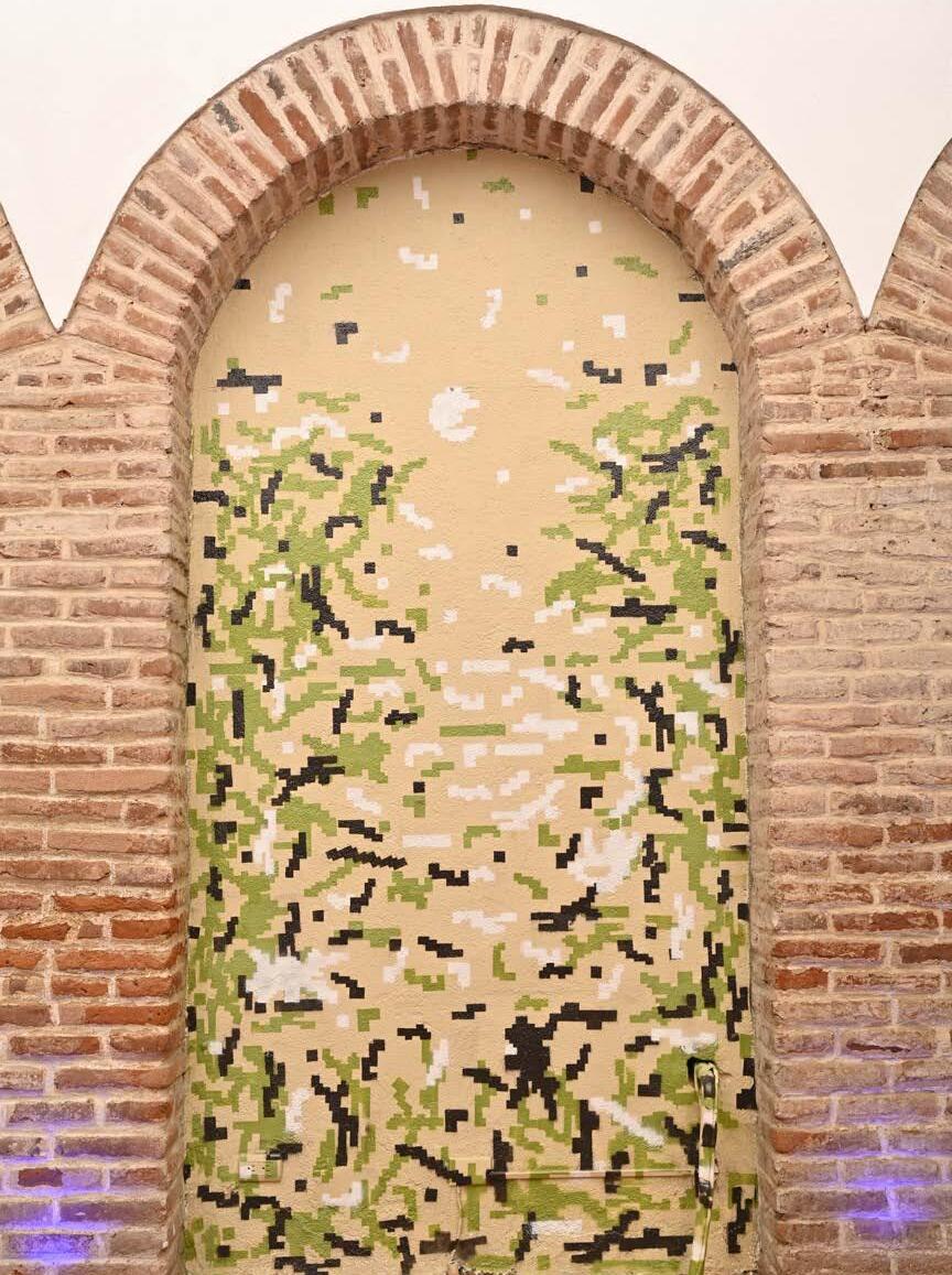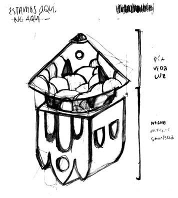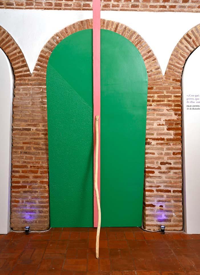 Enfrascado en investigaciones arquitectónicas, Raúl comenzó a interesarse por “la pérdida de esos elementos físicos que, al desvanecerse, arrastran también la memoria —en especial, la memoria colectiva—”. Aquí, en la Capilla de los Remedios, posiblemente falta una campana. Falta también, en el bajorrelieve del frontón, el escudo de los Dávila, la familia que erigió esta edificación. “Pero no solo falta el escudo, no solo falta la campana… es que falta la gente, falta todo”, explica. Aun así, ve esperanza en esas vacantes: la Capilla inicialmente fue una edificación privada y desde entonces ha tenido varias vidas, incluyendo el papel que desempeña en esta exposición como espacio cultural. Por eso, la masa amorfa que recorre la fachada intenta llenar con nuevas posibilidades la ruta de puntos de olvido y vacío de este edificio.