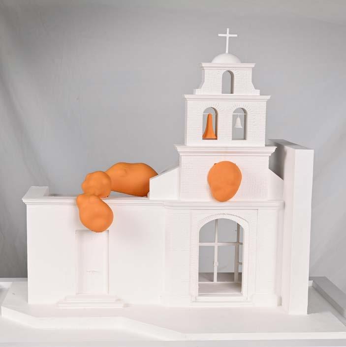 Immersed in architectural research, Raúl began to explore “the loss of those physical elements that, as they fade, also drag memory away —especially collective memory.” Here, in the Capilla de Los Remedios, there might be a missing bell from the original iteration. Also missing, on the pediment’s bas-relief, is the Dávila family crest —the clan who built this structure. “But it’s not just the crest, it’s not just the bell… it’s the fact that the people are missing, and everything is missing,” he explains. Even so, he sees hope in those absences: the chapel was initially a private edifice and has since lived many lives, including its role in this exhibition as a cultural space. For that reason, the amorphous mass that runs along the façade seeks to fill, with new possibilities, the chain of voids and forgotten spots that mark this building’s path.
