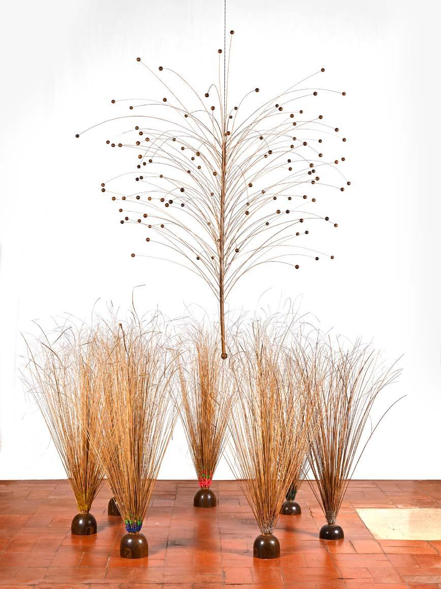 El guayacán es la dureza por antonomasia: un árbol de madera tan dura que servía para crear la base de los timones de los navíos europeos de la era colonial. Natalia la presenta como ligera: tallada y dispuesta de forma flotante. La copa de la palma suele ser compañera del cielo, alta e imponente; Natalia la coloca a ras de suelo. Los montones acostumbran ser manchas difusas en el paisaje; Natalia las ha hecho resaltar llenándolas de cuentas de plástico. “Yo quiero presentar una ficción del mundo natural dominicano”, dice, consciente de que la industria turística suele promover una ficción que —tanto desde fuera como hasta desde dentro— tiende a tomarse como la única realidad.